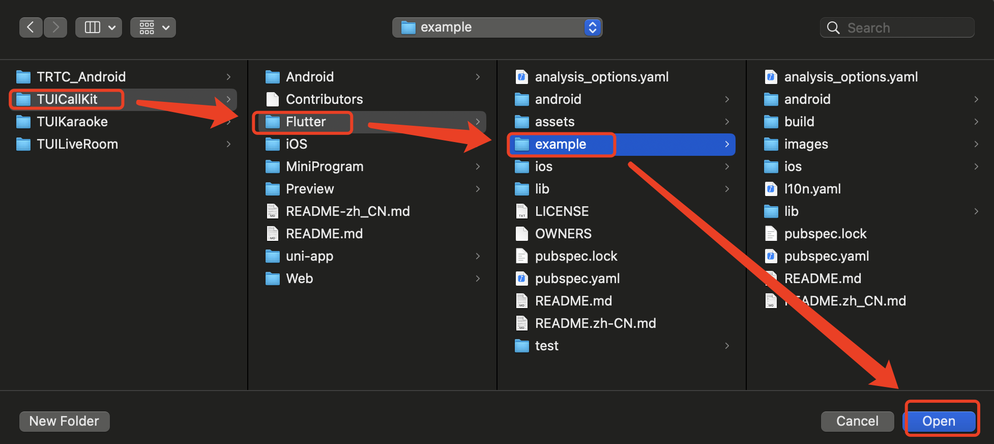 2. Open the TUICallKit Flutter example using Android Studio or VSCode. The following process will use Android Studio as an example: