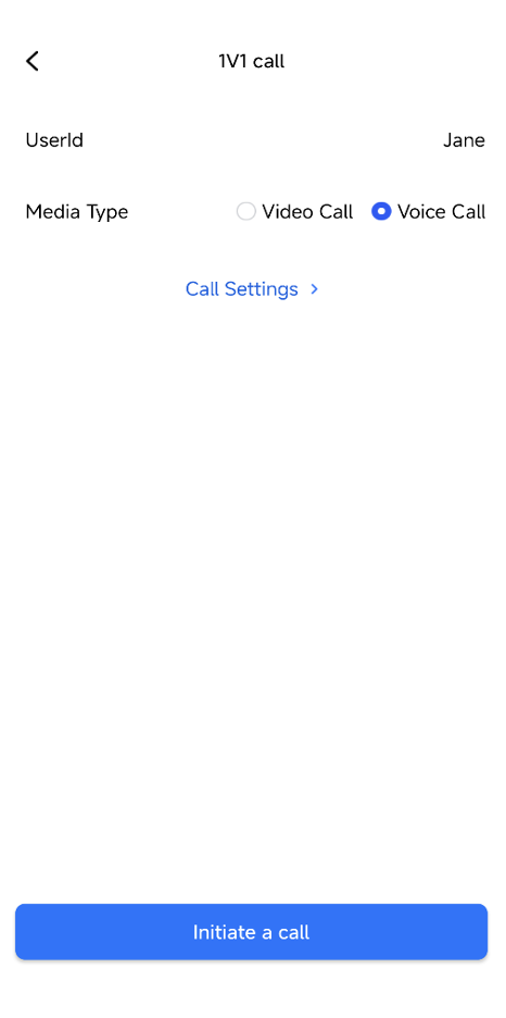 1. On the caller's device, tap 1V1 Call on the interface, enter the callee's UserID in the pop-up window, and select the desired call type.