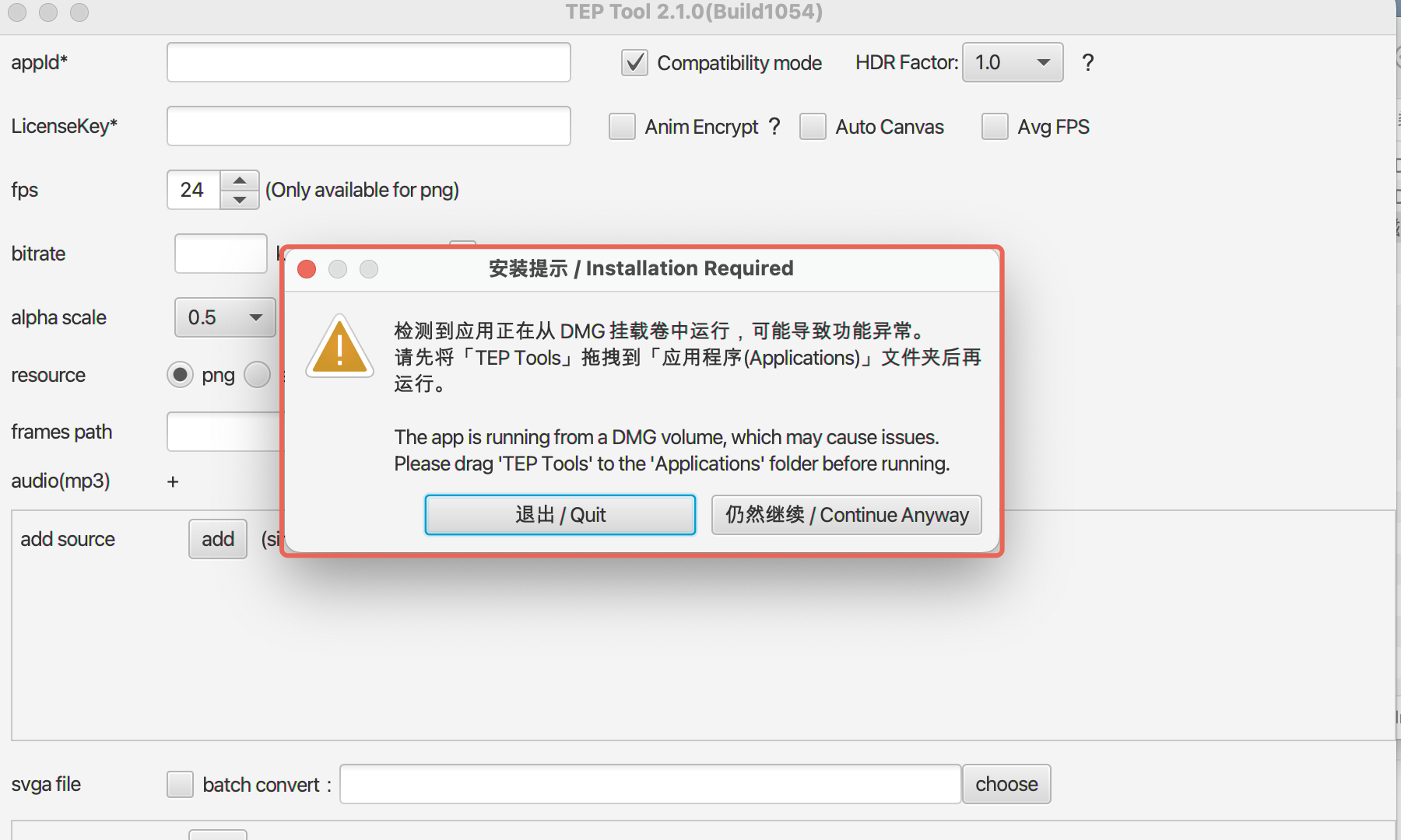 To ensure proper conversion of animation files, please refrain from launching the TEP Tools application directly within the DMG installation environment. This read-only environment will generate the following warning when attempting to operate the tool: