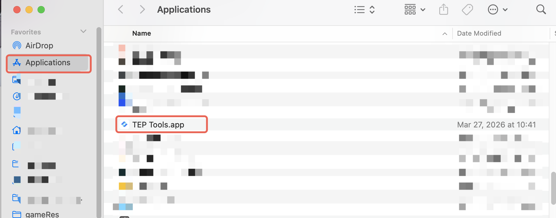 Follow the installation guide illustrated above by dragging the TEP Tools.app file into the Applications folder on the right to complete the installation process. Upon release, the system will copy and move the TEP Tools.app file into your applications. You may then locate the newly installed TEP Tools within your applications and launch it by double-clicking.