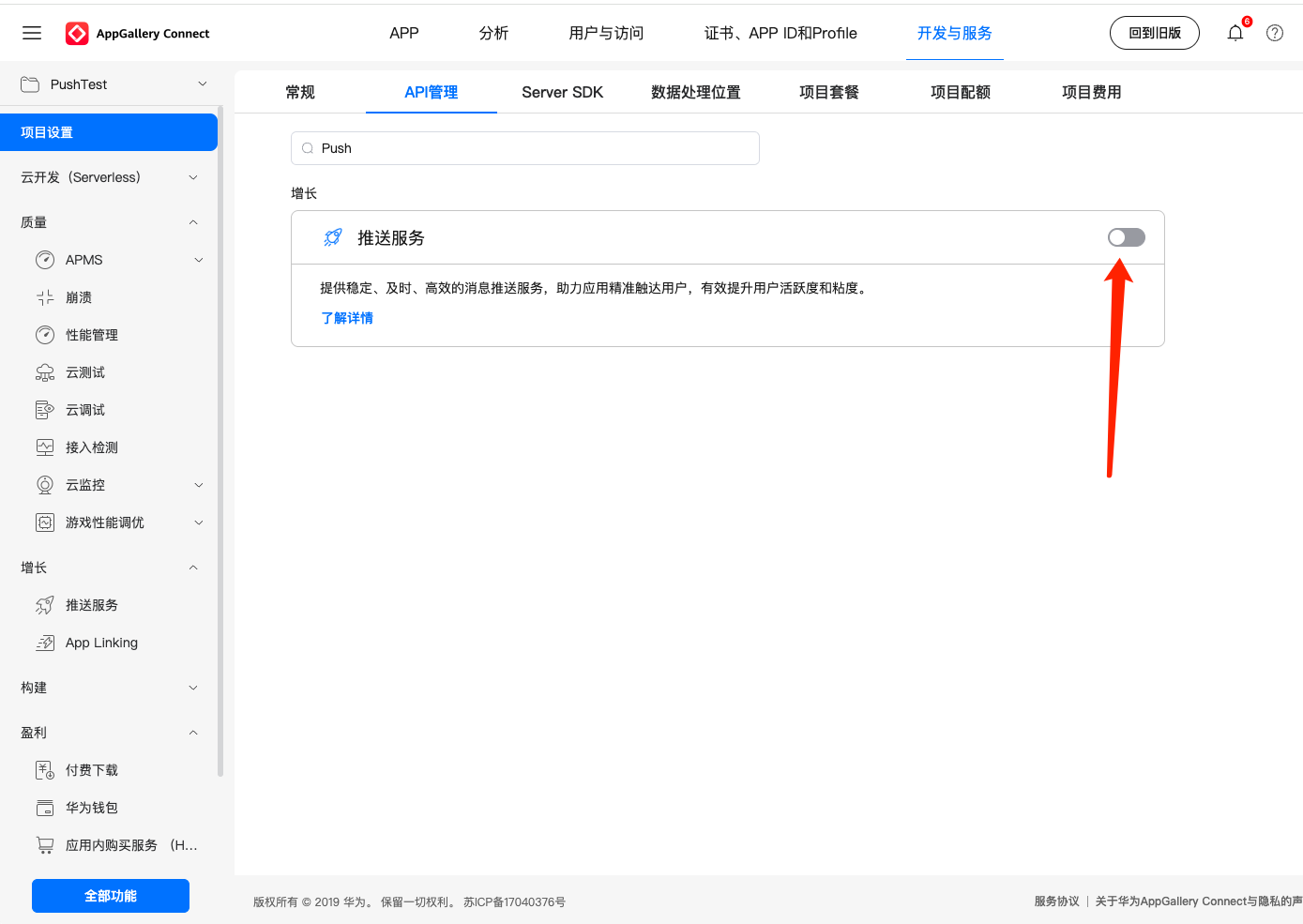 2. In the project setting, search for "Push" on the API management tab and enable the push service.