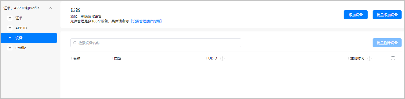 Select Certificates, APP ID and Profile in the left sidebar, choose Device, then enter the Device page.