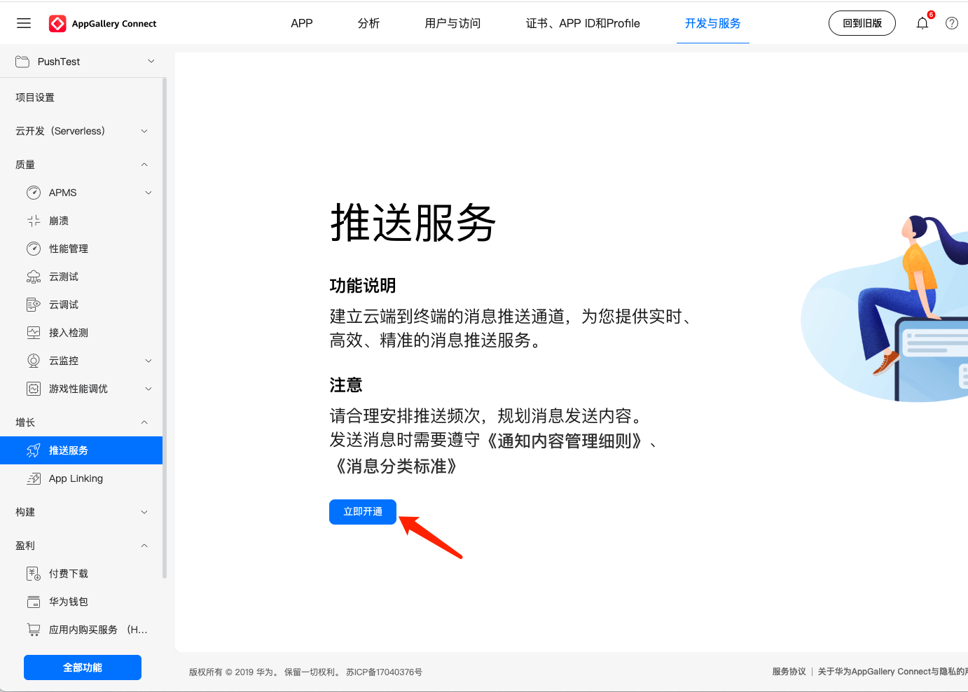 1. Log in to AppGallery Connect, select Develop and Services on the homepage, choose the corresponding project, and click Enable Now to enable the push service.