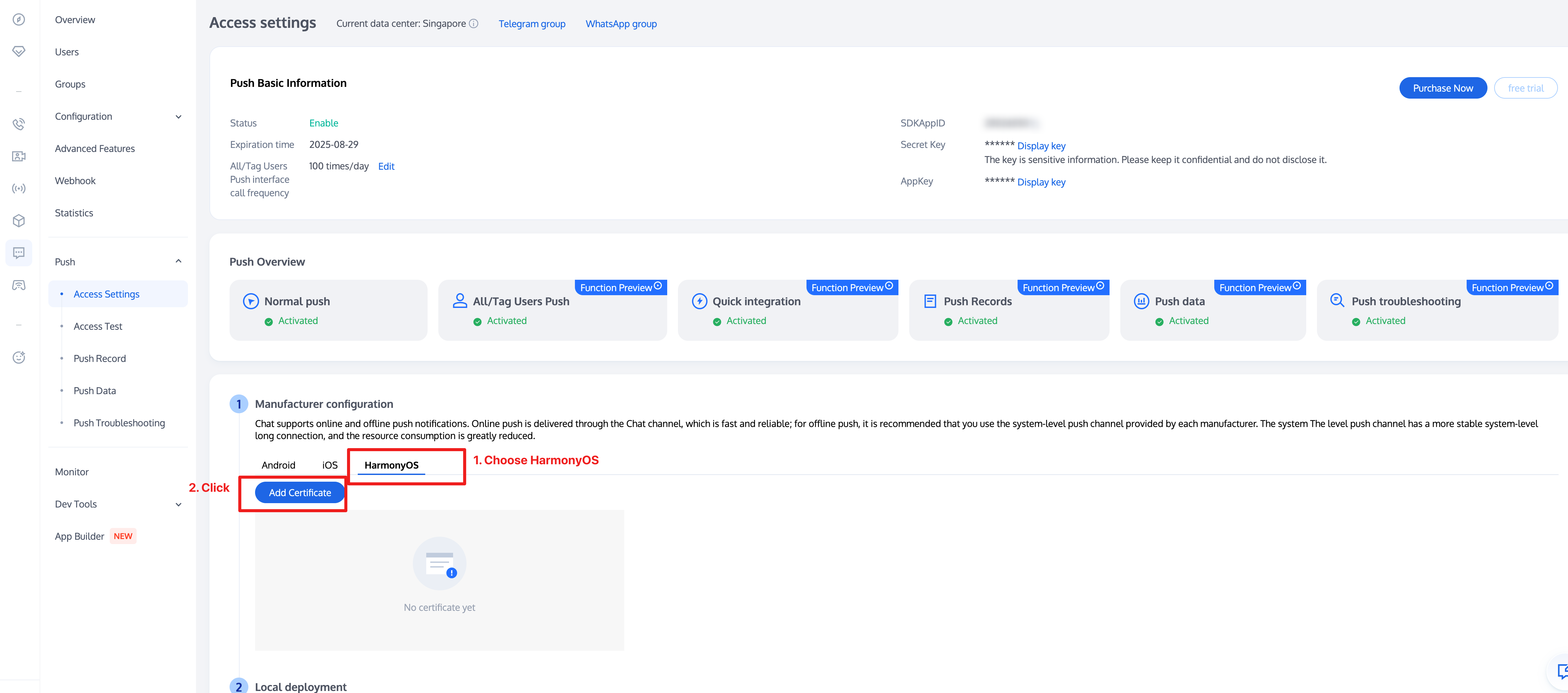 1. Log in to Chat Console, go to the Chat > Push > Access Settings page, and click Add Certificate to create a certificate.