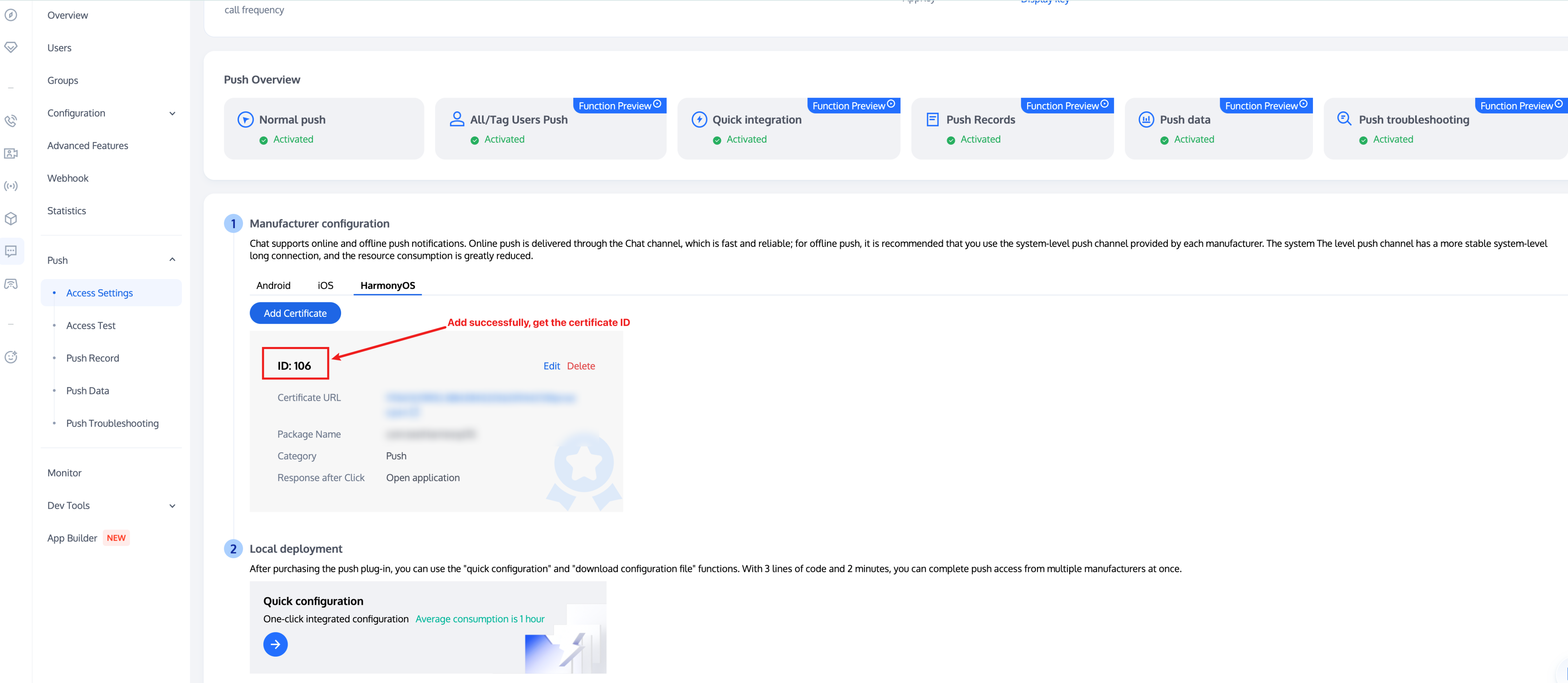 4. After adding a certificate, the IM console will allocate a certificate ID for you to access and use.