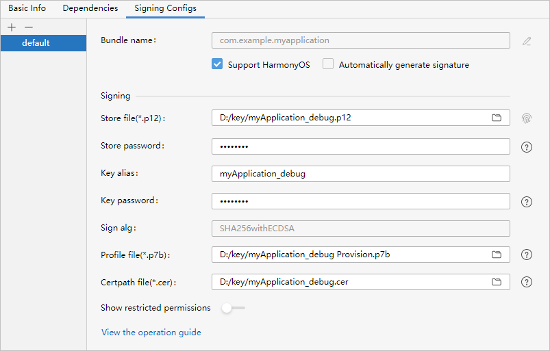 Configure the SecretKey (.p12) file, applied debug certificate (.cer) file, and debug Profile (.p7b) file in DevEco Studio. In the File > Project Structure > Project > Signing Configs window, uncheck "Automatically generate signature" (if it is a HarmonyOS app, check "Support HarmonyOS"), then configure the project's signature information.