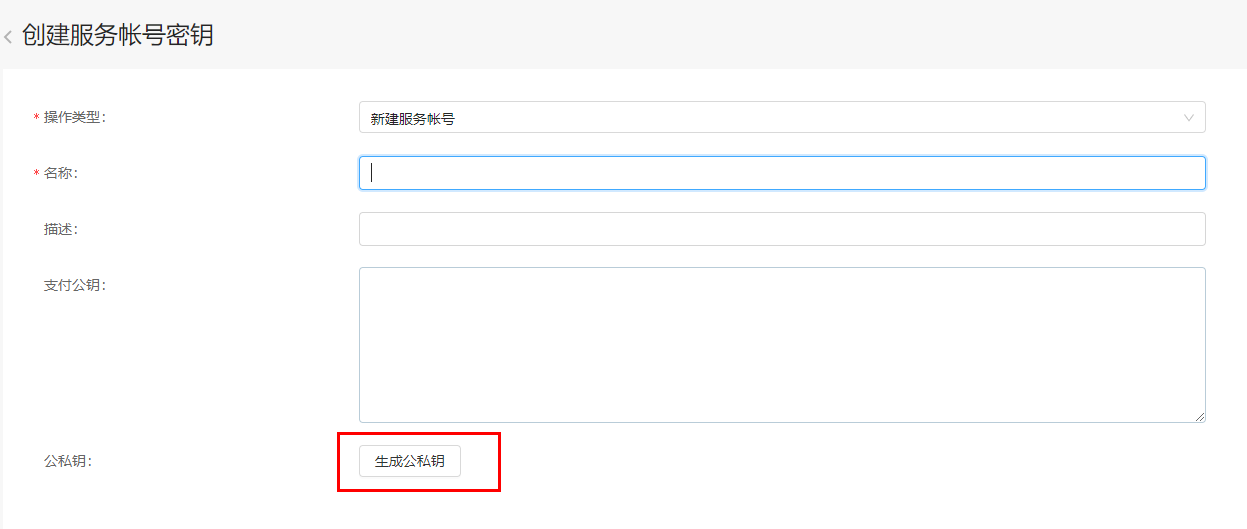 3. Fill in the required fields and click Create public/private key. Create and download the JSON file. The downloaded file is exactly your Service Account credential file.