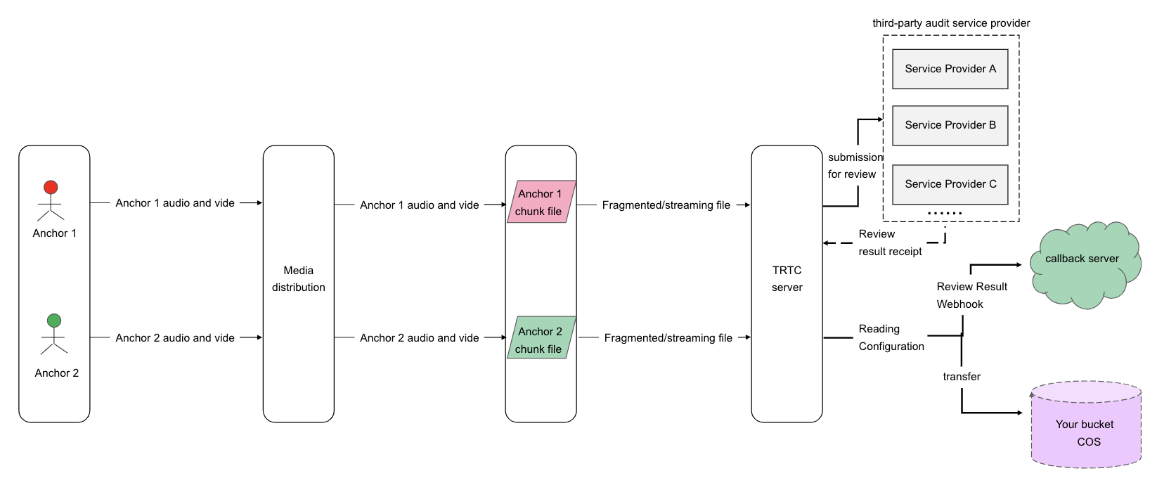 Cloud moderation: Send audio and video content to a third-party vendor via cloud slicing, obtain the results, and return them to the backend via callback.