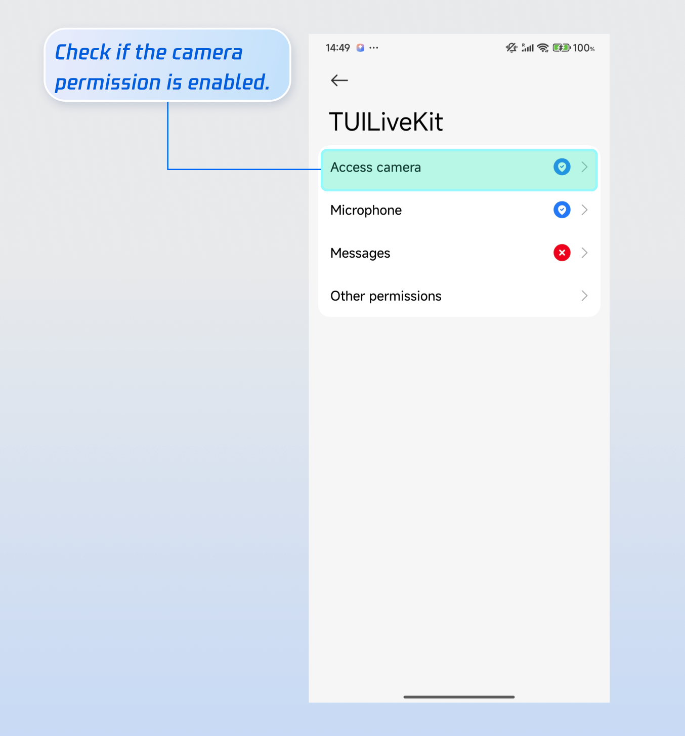 Please go to Phone Settings > App > Camera and check whether camera permission is enabled. Refer to the following example: