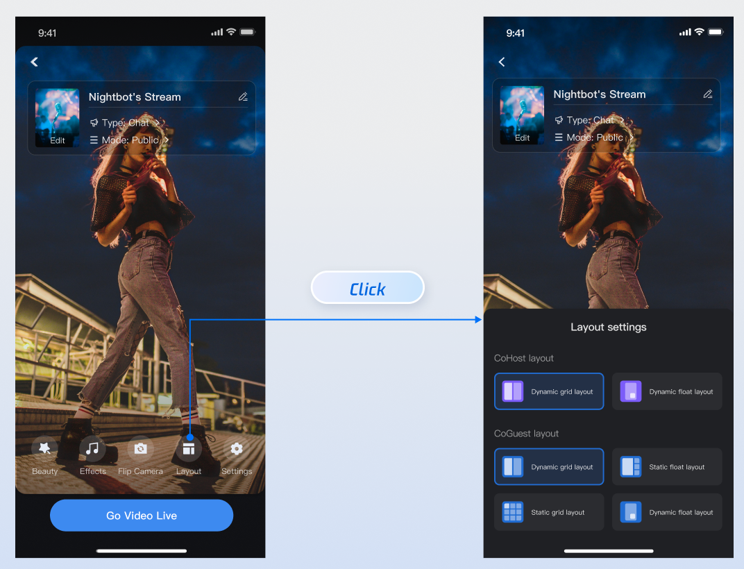 TUILiveKit provides 4 live layout templates. You can select the appropriate style in the "Layout" UI interaction entry on the host setup page: