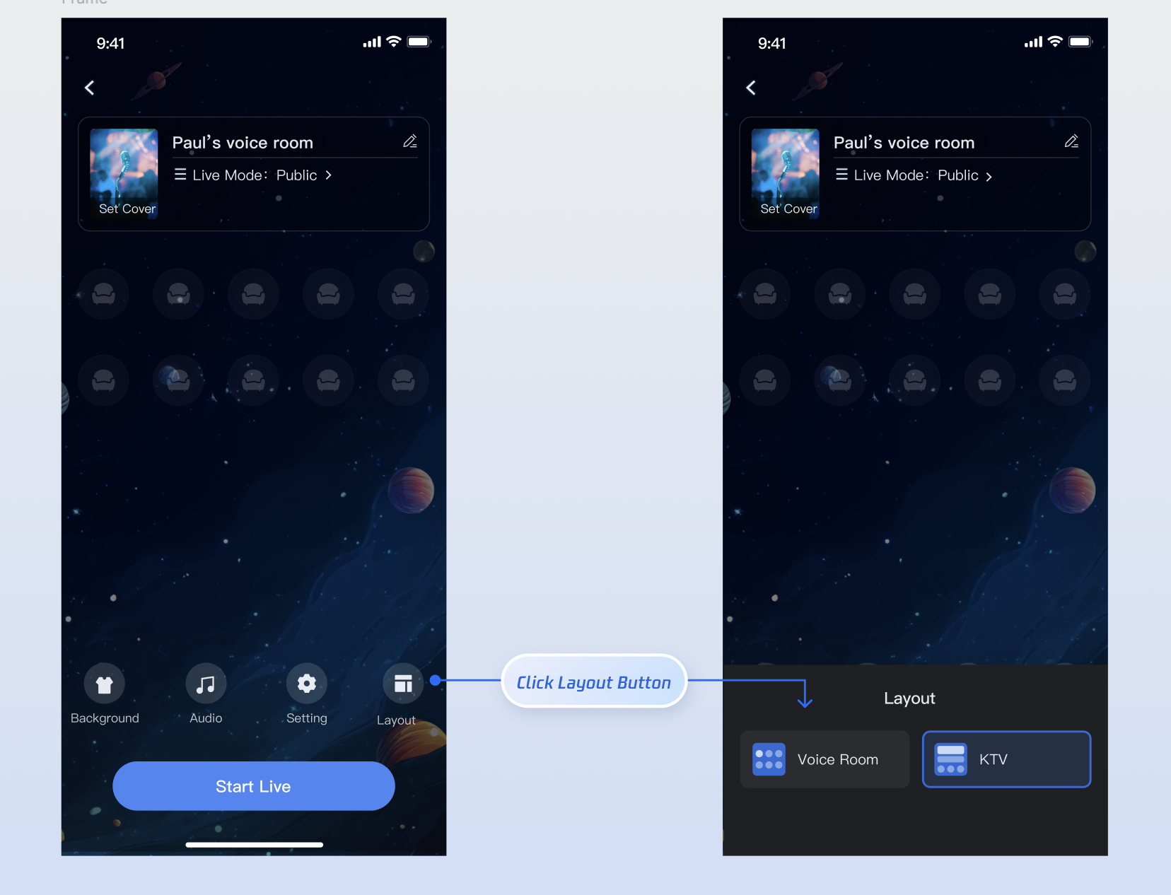 TUILiveKit Voice Room offers two layout styles. Select your preferred style using the "Layout" option on the host's pre-live preview page: