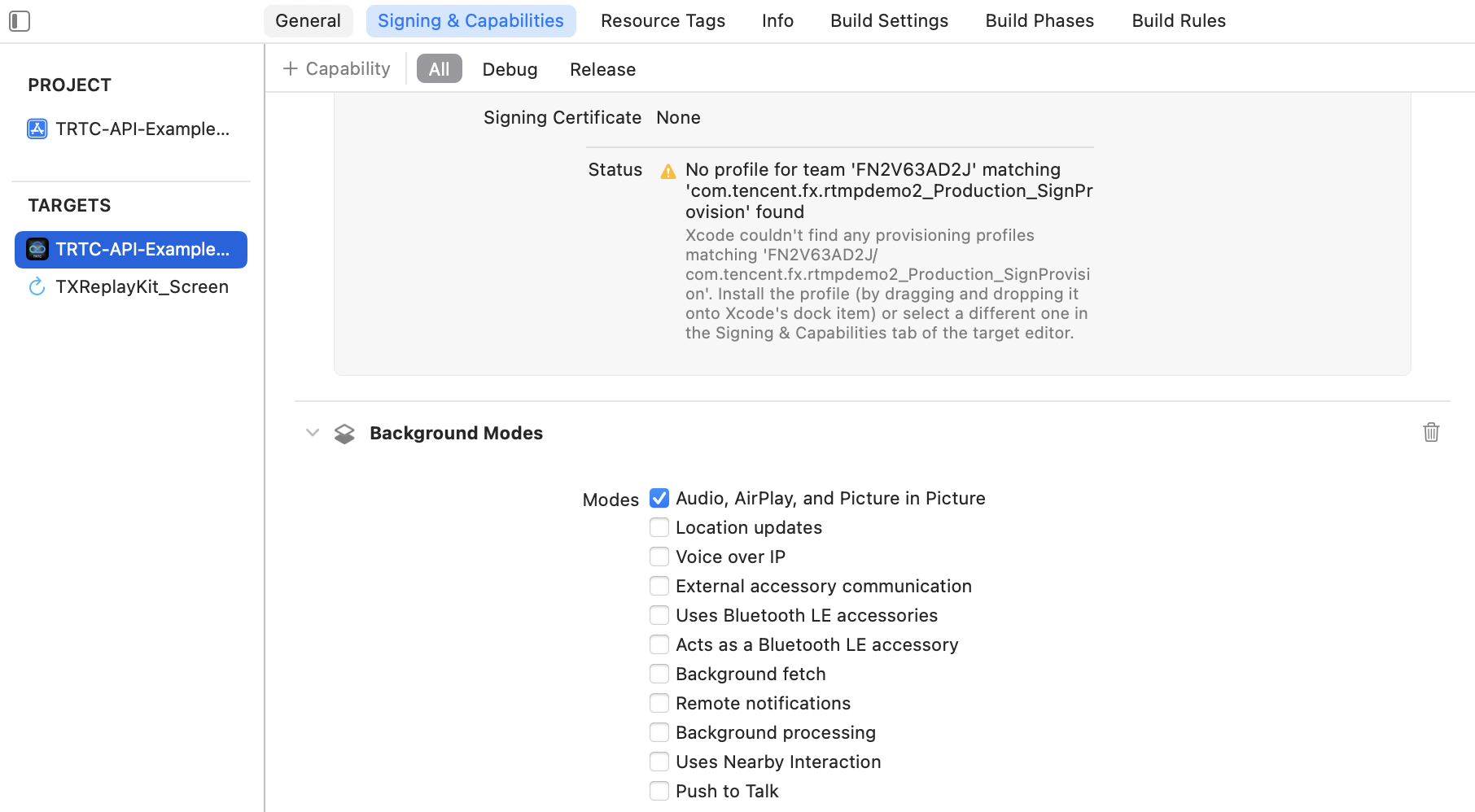5. Background Modesオプションを見つけて、Audio, AirPlay, and Picture in Pictureモードにチェックを入れます。