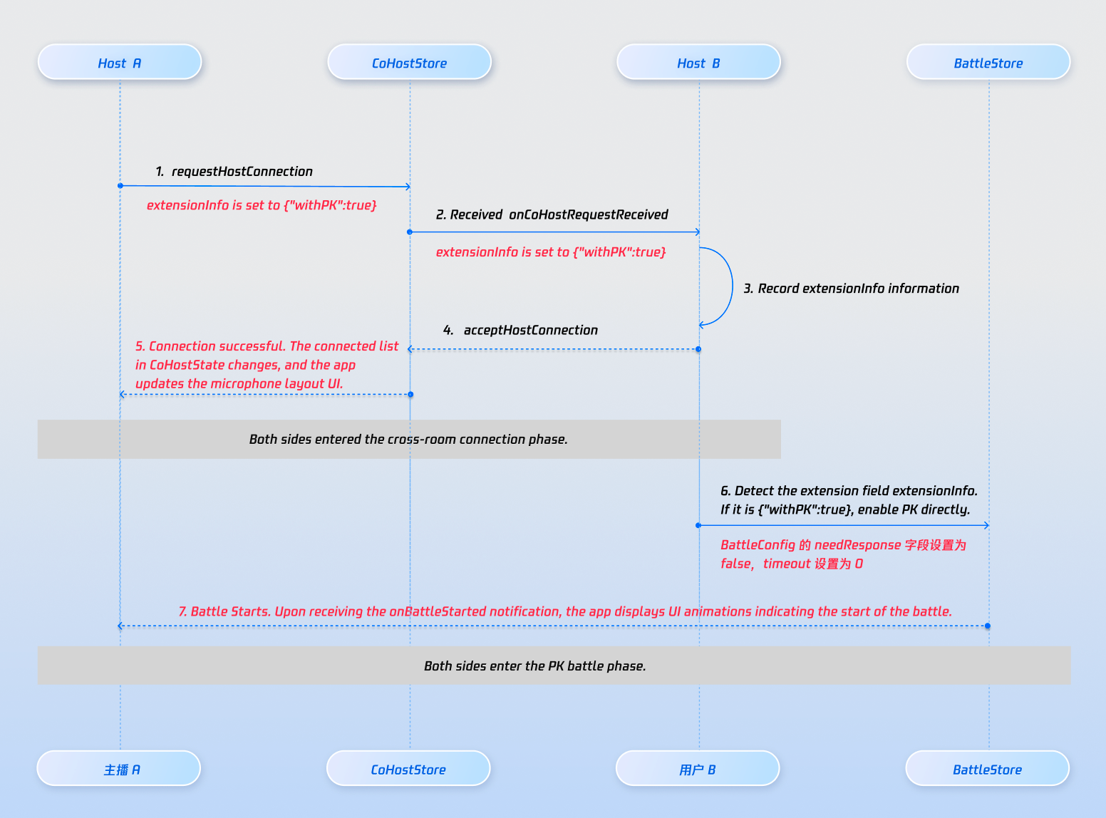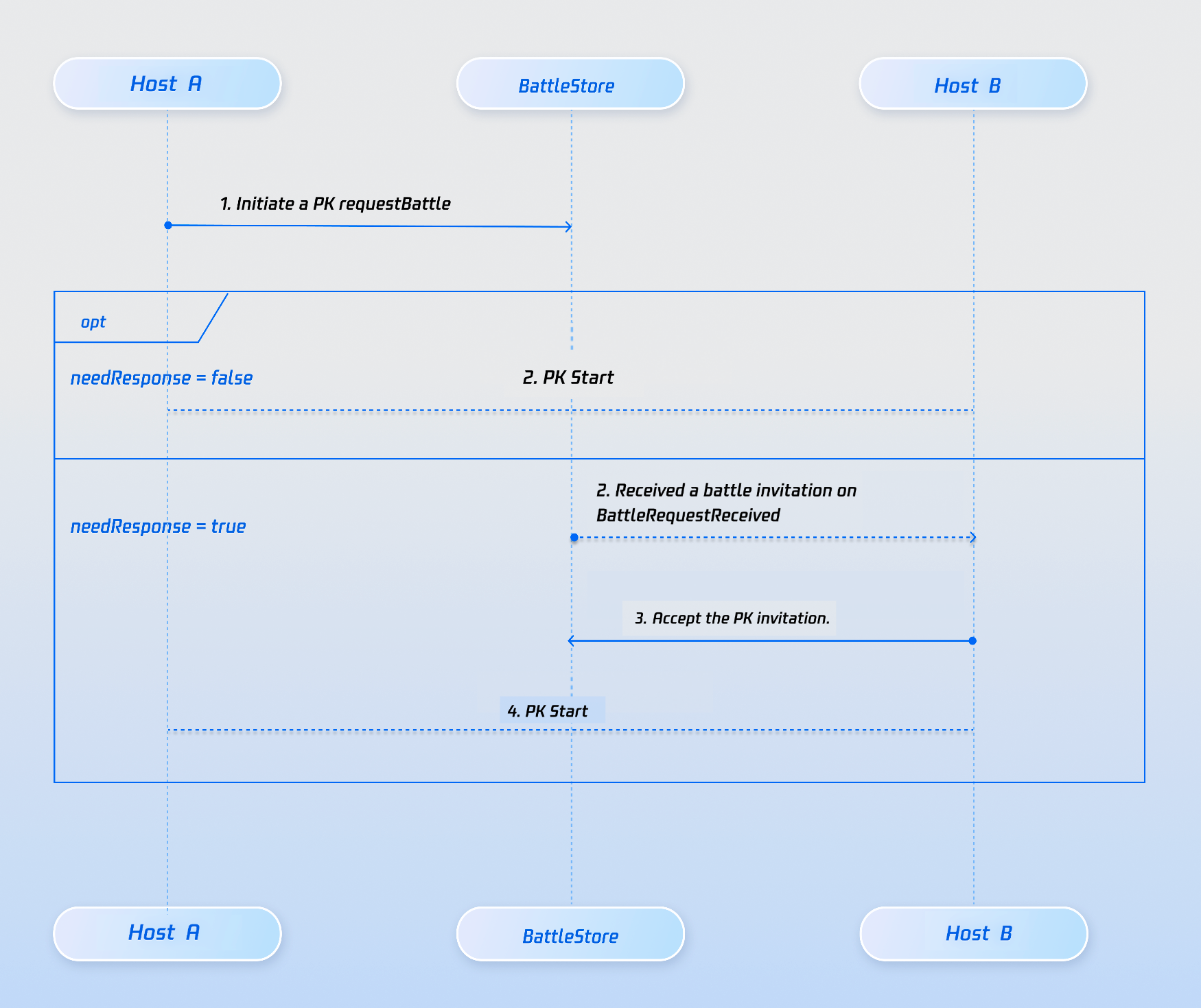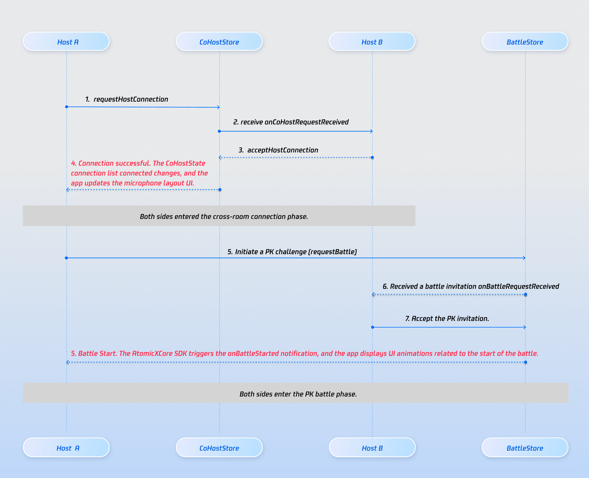 To start a PK battle among connected hosts, use BattleStore.requestBattle. Configure PK duration, whether a response is required, and any extension info.