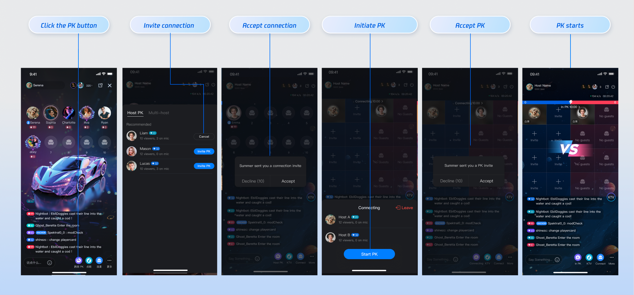 To initiate a connection or PK, the host must retrieve the current list of live rooms and select a target host.
