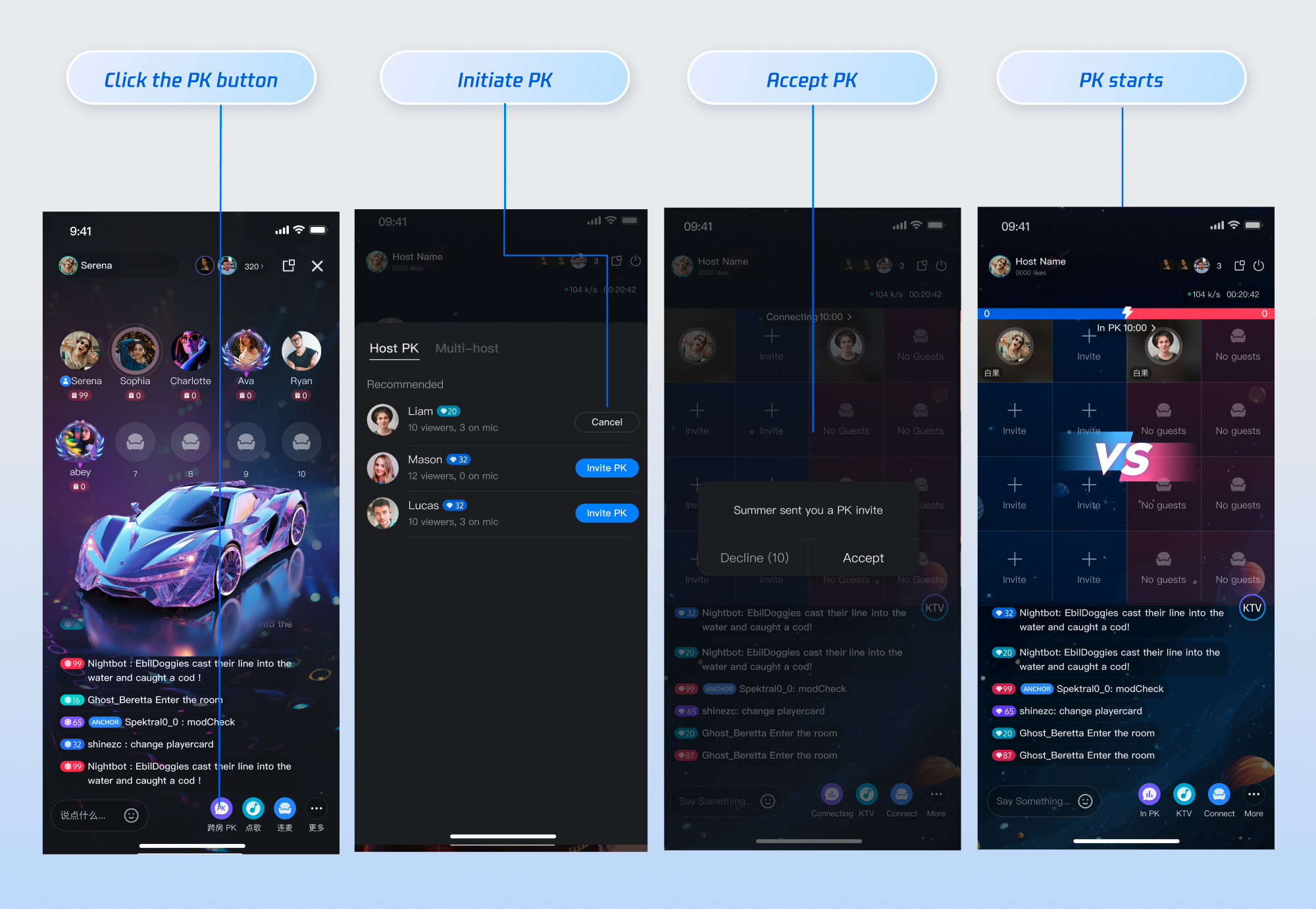 4. UI enters PK mode and displays a progress bar (based on gifts, likes, etc.).