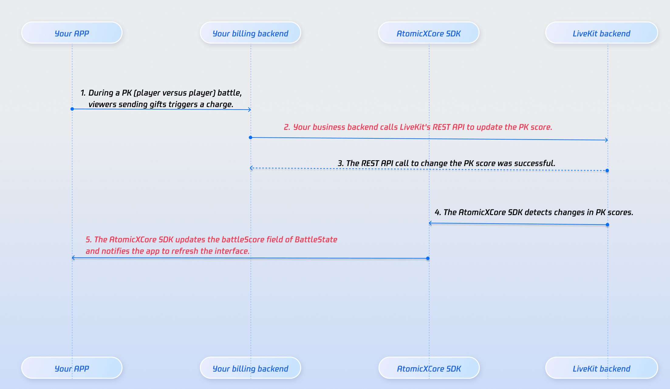4. LiveKit Backend Syncs to Client: The backend automatically synchronizes the updated PK score to all clients.