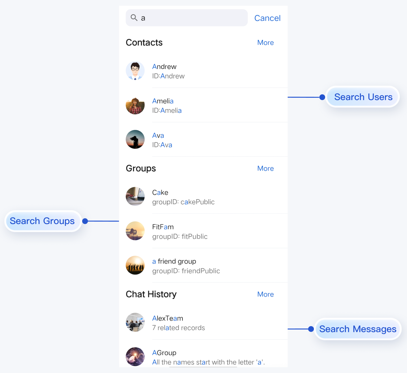 | onGroupSelect: (GroupSearchInfo) -> Unit | Webhook triggered when a searched group item is clicked; optional parameter. |