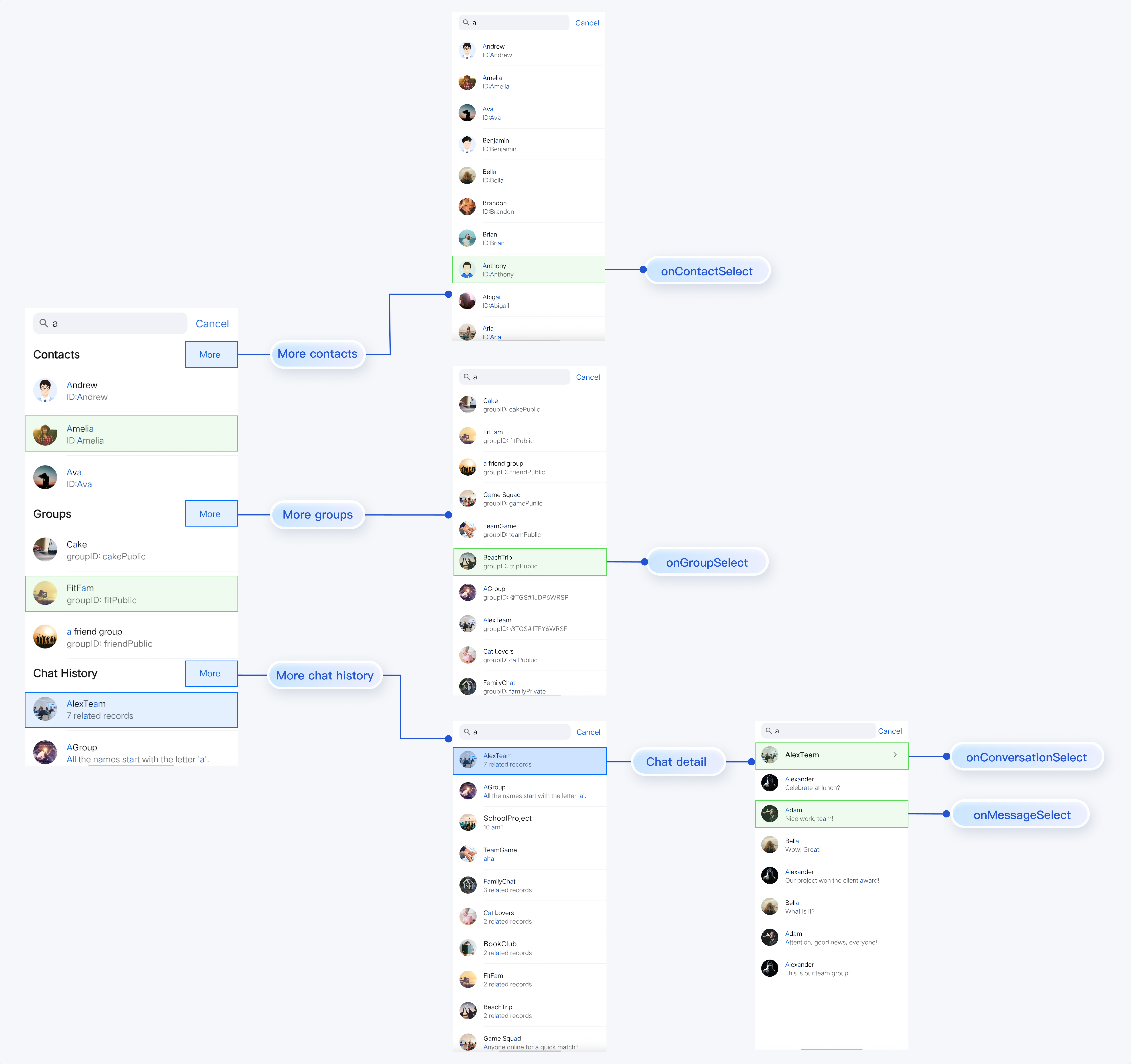 onContactSelect, onGroupSelect, onConversationSelect, or onMessageSelect). You must implement custom navigation in these webhook handlers (for example, navigating to your custom chat interface). Example: