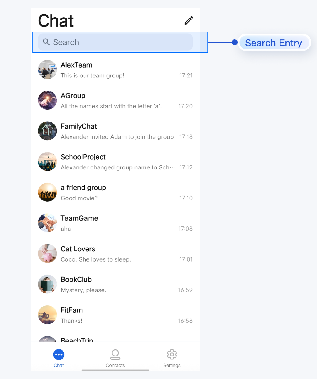 // Initialize SearchBarSearchBar(onTapItem: { result inhandleSearchResult(result)})// Handle click events on search results// The onConversationClick event is dispatched to a higher-level component. This is optional and can be adapted based on your project architecture.private func handleSearchResult(_ result: Any) {if let friendInfo = result as? FriendSearchInfo {// Handle selection of a contact from search resultslet conversationID = ChatUtil.getC2CConversationID(friendInfo.userID)var conversation = ConversationInfo(conversationID: conversationID)conversation.type = .c2cconversation.title = friendInfo.friendRemark ?? friendInfo.userInfo.nicknameconversation.avatarURL = friendInfo.userInfo.avatarURL// Dispatch event to the parent component to navigate to the C2C Chat listonConversationClick?(NavigationInfo(conversation: conversation))} else if let groupInfo = result as? GroupSearchInfo {// Handle selection of a group from search resultslet conversationID = ChatUtil.getGroupConversationID(groupInfo.groupID)var conversation = ConversationInfo(conversationID: conversationID)conversation.type = .groupconversation.title = groupInfo.groupNameconversation.avatarURL = groupInfo.groupAvatarURL// Dispatch event to the parent component to navigate to the Group chat listonConversationClick?(NavigationInfo(conversation: conversation))} else if let messageDict = result as? [String: Any],let messageInfo = messageDict["message"] as? MessageInfo,let conversationID = messageDict["conversationID"] as? String{// Handle selection of a message resultvar conversation = ConversationInfo(conversationID: conversationID)if conversationID.hasPrefix("c2c_") {conversation.type = .c2c} else {conversation.type = .group}conversation.title = messageDict["conversationName"] as? Stringconversation.avatarURL = messageDict["conversationAvatar"] as? String// Dispatch event to the parent component to navigate to the conversation and highlight the selected messageonConversationClick?(NavigationInfo(conversation: conversation, locateMessage: messageInfo))} else if let conversationDict = result as? [String: Any],let conversationID = conversationDict["conversationID"] as? String {// Handle selection of a conversation resultvar conversation = ConversationInfo(conversationID: conversationID)if conversationID.hasPrefix("c2c_") {conversation.type = .c2c} else {conversation.type = .group}conversation.title = conversationDict["conversationName"] as? Stringconversation.avatarURL = conversationDict["conversationAvatar"] as? String// Dispatch event to the parent component to navigate to the conversationonConversationClick?(NavigationInfo(conversation: conversation))}}