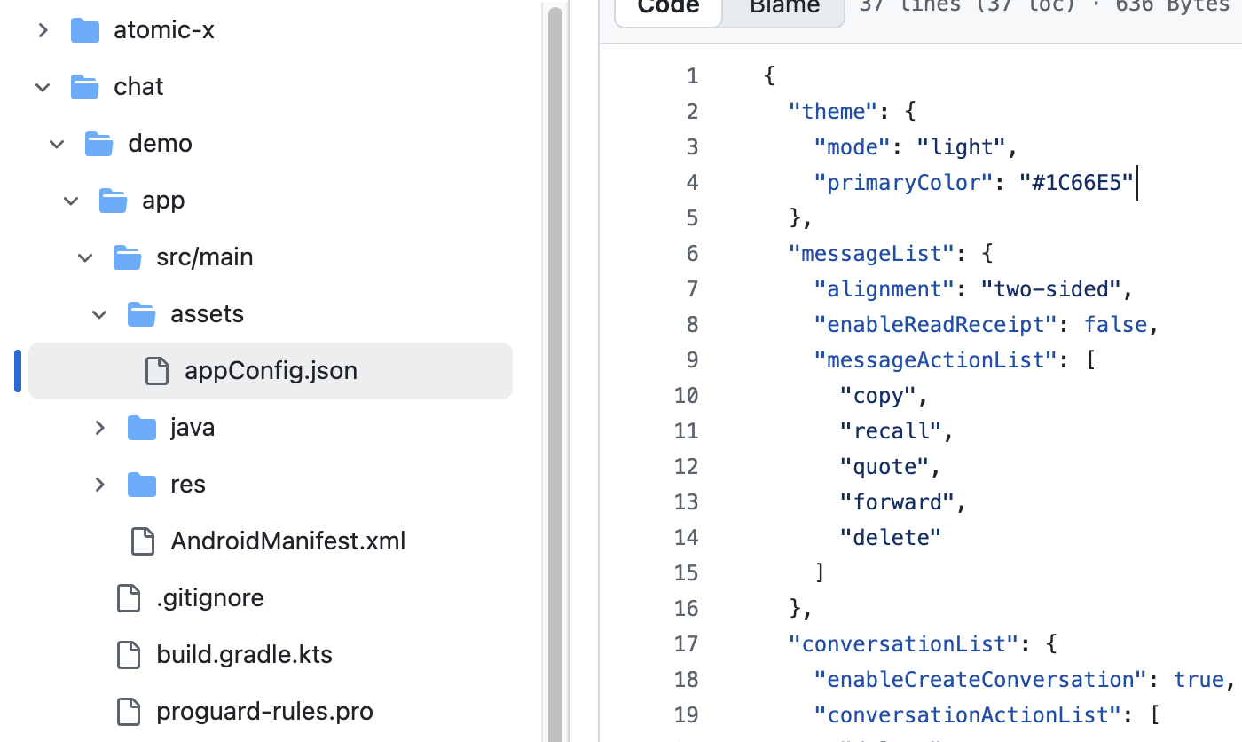 Drag appConfig.json into your project. For example, in the open-source demo TUIKit Android Compose on GitHub, appConfig.json is located in the assets folder under demo/app: