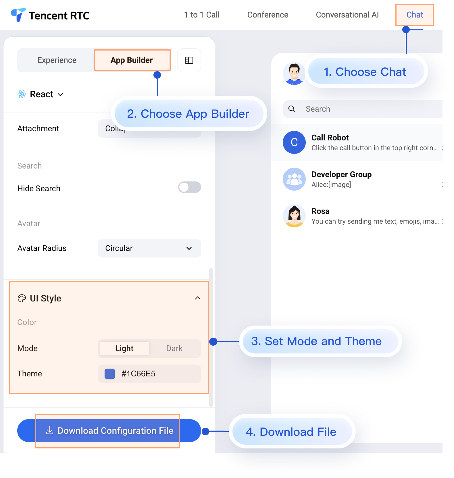 appConfig.json map directly to the configuration options in AppBuilder. Appearance settings are under the theme section:{"theme": {"mode": "light", // Theme mode: light - Light mode, dark - Dark mode, system - Follow system"primaryColor": "#E65100" // Primary color, hexadecimal color value},"messageList": {"alignment": "two-sided","enableReadReceipt": false,"messageActionList": ["copy","recall","quote","forward","delete"]},"conversationList": {"enableCreateConversation": true,"conversationActionList": ["delete","mute","pin","markUnread"]},"messageInput": {"hideSendButton": false,"attachmentPickerMode": "collapsed"},"search": {"hideSearch": false},"avatar": {"shape": "circular"}}