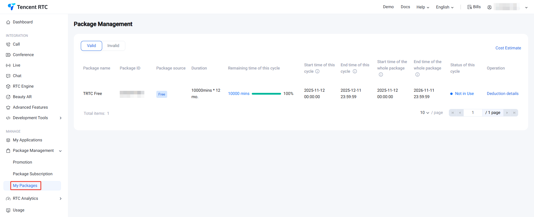 TRTC supports viewing the usage of Package under your account through the console. You can click Package Management > My Package in the left sidebar to view package info in the Package List.