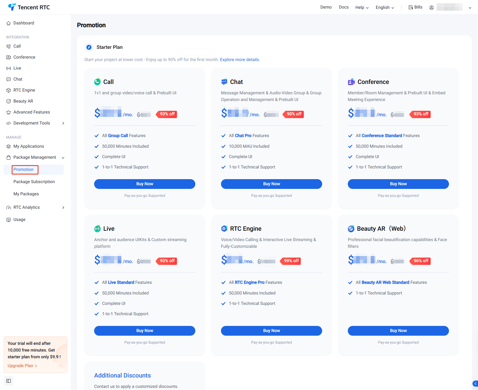 Package types are divided into Free Trial and monthly package, the former can deduct audio and video, recording, mixtranscoding time, the latter can deduct audio and video time, the specific deduction ratio details can be seen free time description.