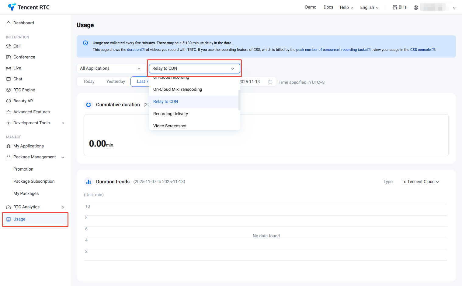 The statistics of the TRTC console's Relay to CDN usage are mainly used to display the details of the bypass push service provided by TRTC. If you use the third-party repush billing provided by the CSS, go to the CSS console to view the statistics.