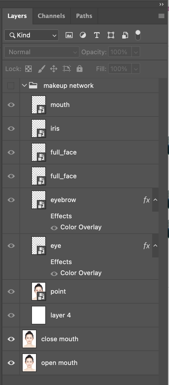 After exporting, refer to the sample structure diagram for the makeup package file layout. Exported makeup layer images (eye, eyebrow, lip, and full-face makeup) must be 768 × 1024 pixels. Export iris materials separately at 125 × 125 pixels, as described in the "Iris Material Creation" section.