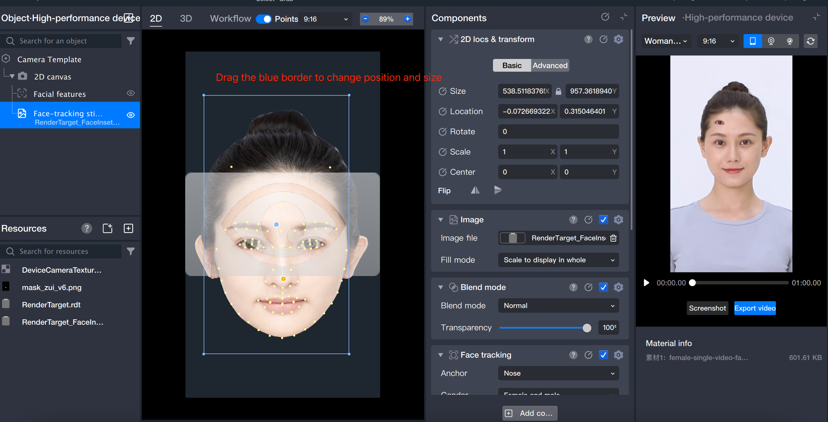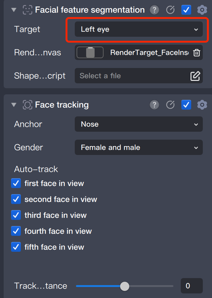 2. Once facial feature extraction is enabled, a file named RenderTarget_FaceInset1.rdt will appear in the Resource panel. This file contains the output from the segmentation process—the extracted facial features are stored here and can later be used as stickers.