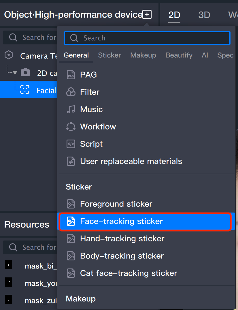 1. Add a face-following sticker in the Object panel. You can also add foreground stickers, gesture-following stickers, body-following stickers, or cat-face-following stickers.