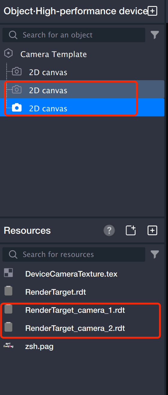 For example, in a dual-frame shooting project, you need three 2D canvases: the bottom canvas holds the two upper canvases, and the third canvas acts as the final rendering layer. As shown below, the canvases are organized hierarchically, and the first two canvases should be added to the third canvas in vertical order.
