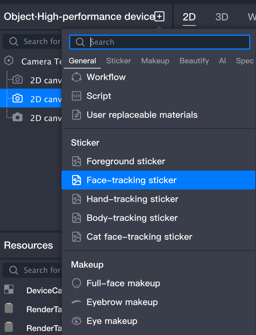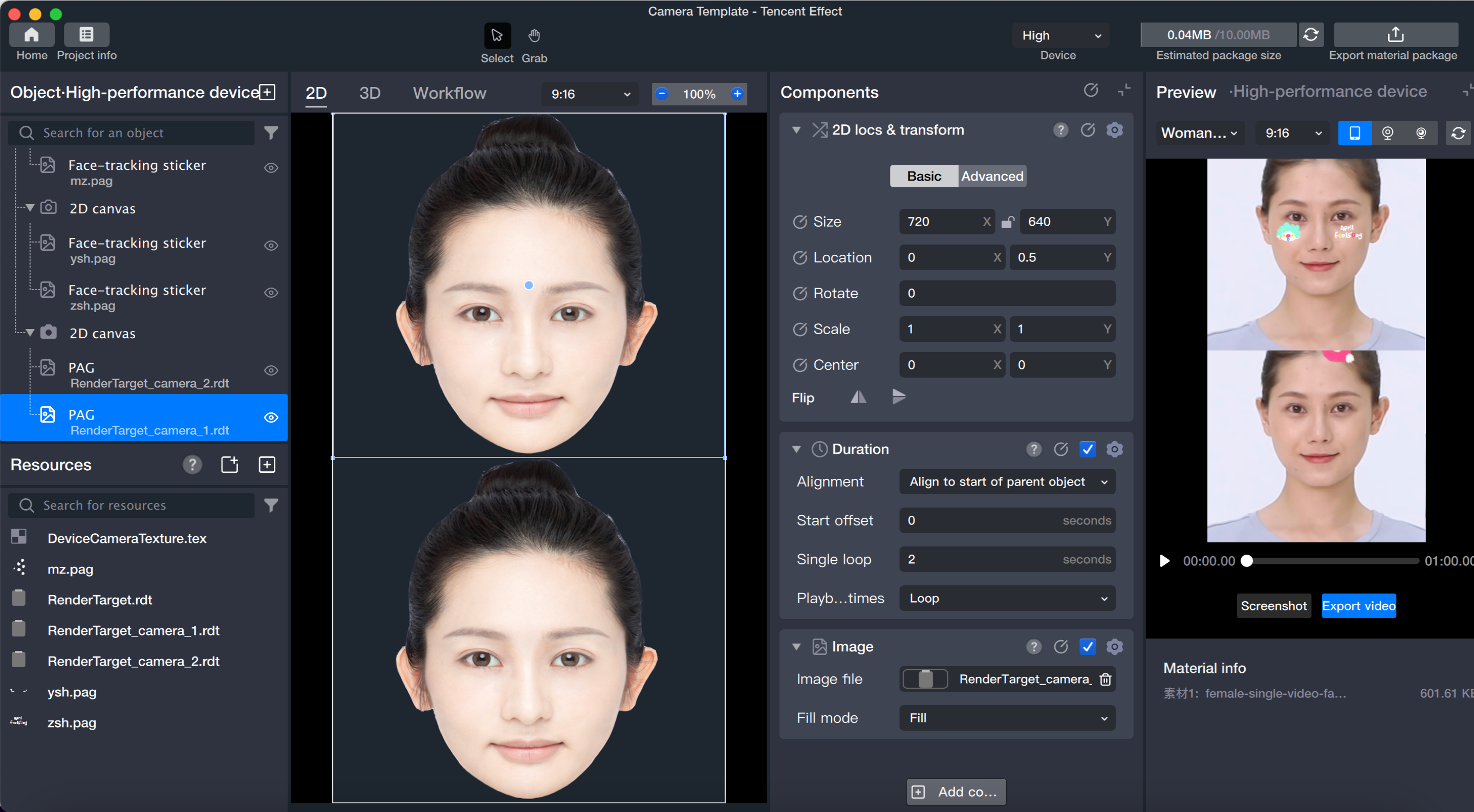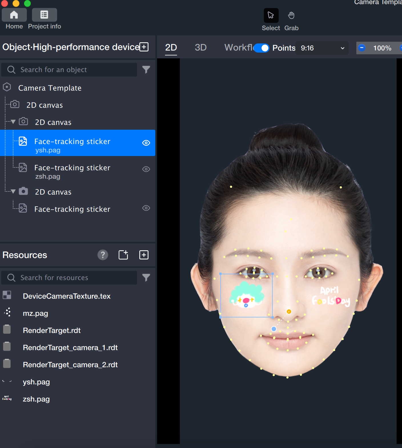 3. Add face-following stickers to the two 2D canvases and preview the effect.