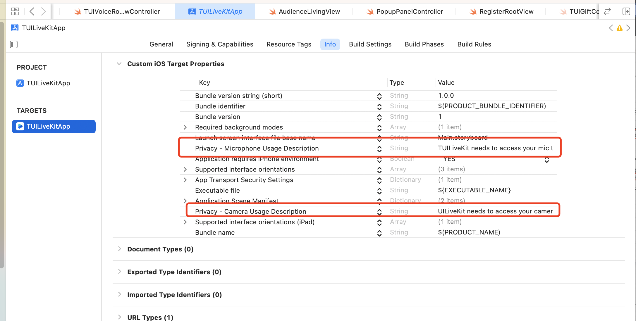 오디오/비디오 기능을 사용하려면 마이크와 카메라 사용 권한이 필요합니다. App의 Info.plist에 다음 두 항목을 추가하여 각각 마이크와 카메라 권한 요청 시 시스템 팝업 대화상자의 메시지를 설정하십시오.