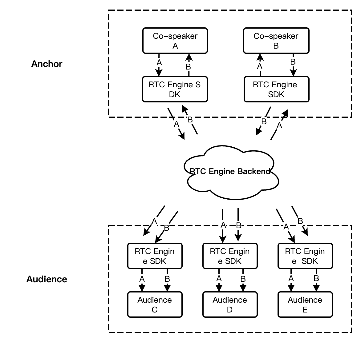 This scenario recommends the solution of the speaker pulling and pushing RTC streams while the audience pulls RTC single streams.