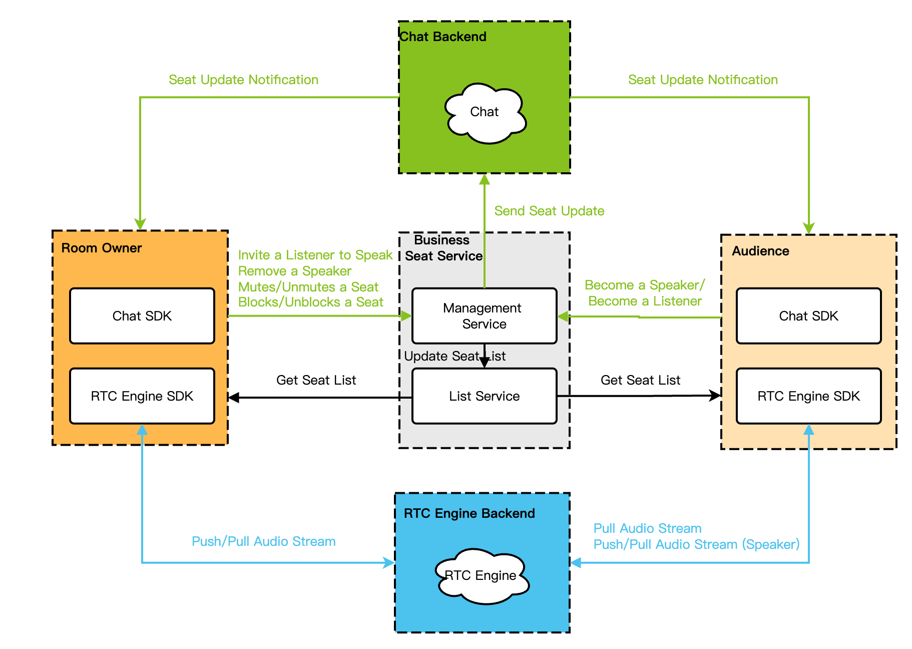 The solution architecture of seat management will be organized through the combination of RTC Engine and Chat. In the overall architecture of room management, the room owner has the highest permission to invite users to speak, remove users, mute/unmute seat audio, and block/unblock seats. Listeners can also request to speak and become anchors to interact with the rest of the anchors in the room.