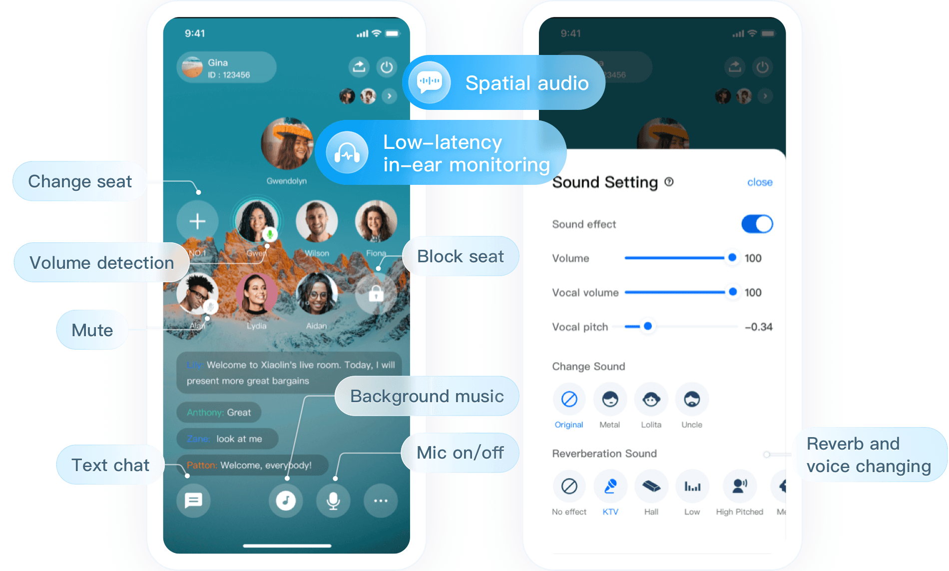 A voice chat room is a virtual space for online social interaction in audio-only mode. Normally, several seats are available in the room where anchors and mic-connecting audience chat via microphones, and other listeners can enter the room to listen. Different room types correspond to varying number of seats and varying maximum audience capacities. RTC Engine supports up to 50 people chatting via microphones simultaneously with smooth switching between becoming a speaker and leaving the seat and voice chat latency less than 300 ms. It also provides a variety of audio effects, such as voice changing, ambiance sound effects, and reverb to enrich the voice chat experience. Combined with Chat, it supports various forms of message interaction such as public chat, private chat, group chat, likes, and gift sending to create a lively and engaging chat interaction experience.