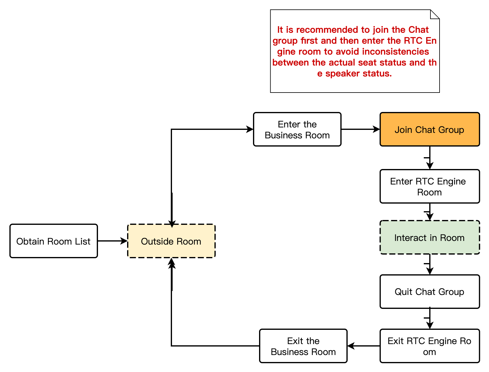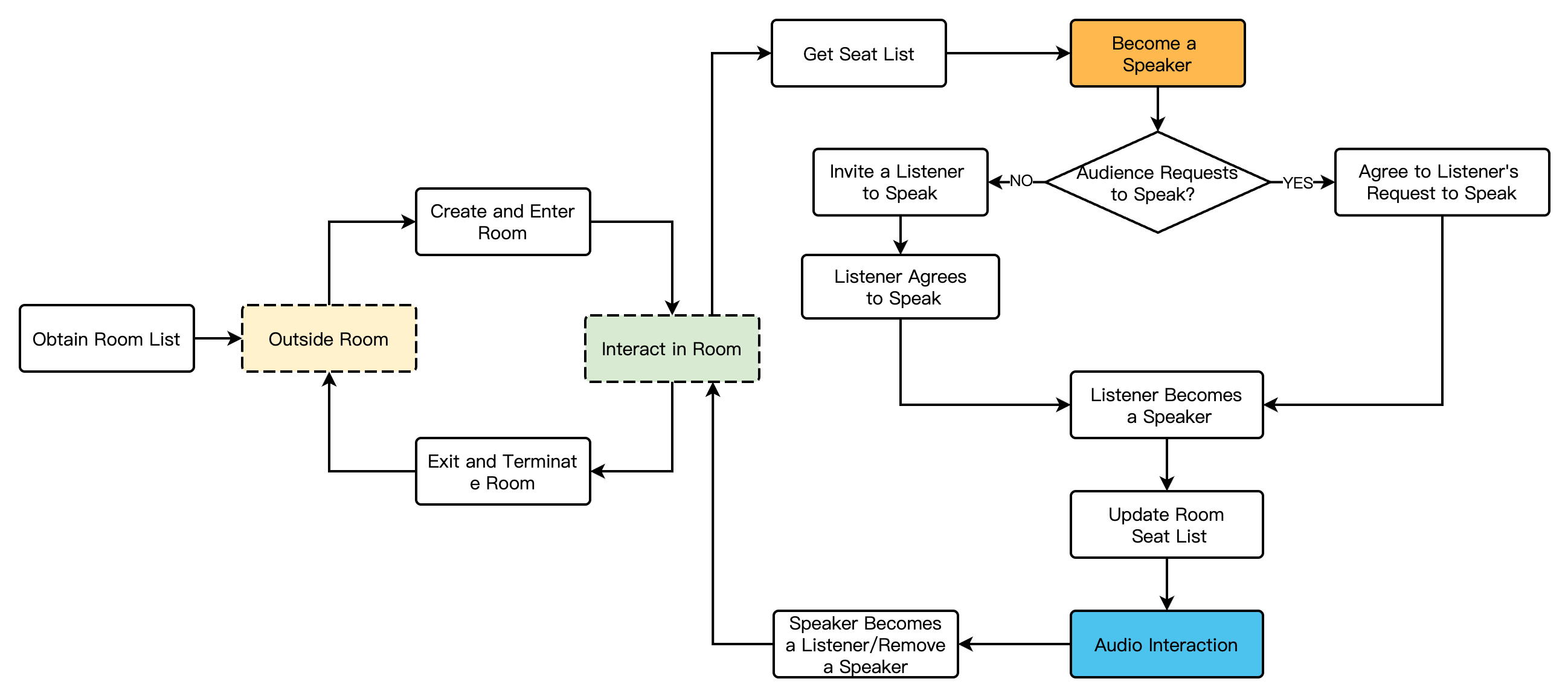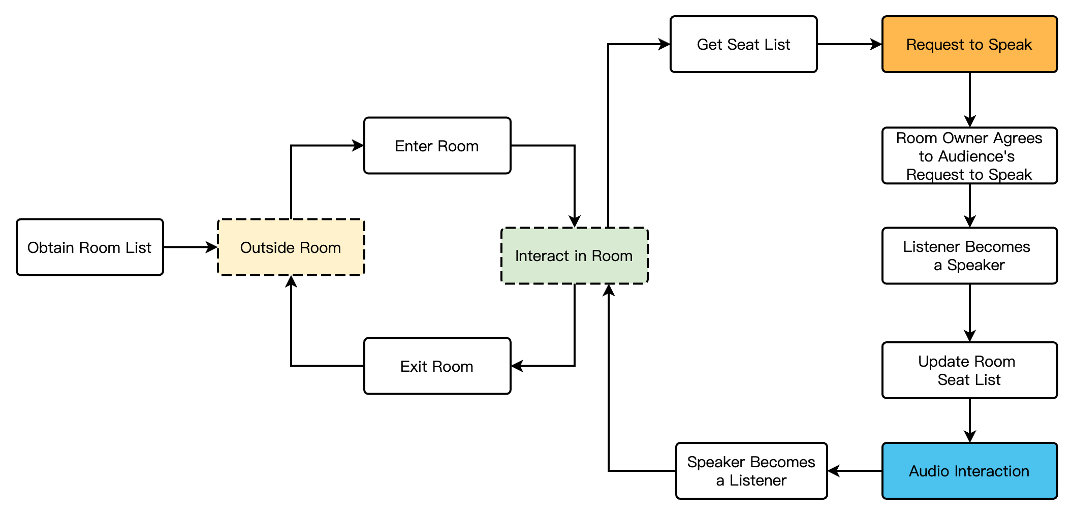 RTC Engine Room Management: Mainly used for interaction and transmission of audio streams, such as sending and listening to voice/music of anchors/listeners. It also distinguishes by room dimension, with features including entering/exiting RTC Engine rooms.