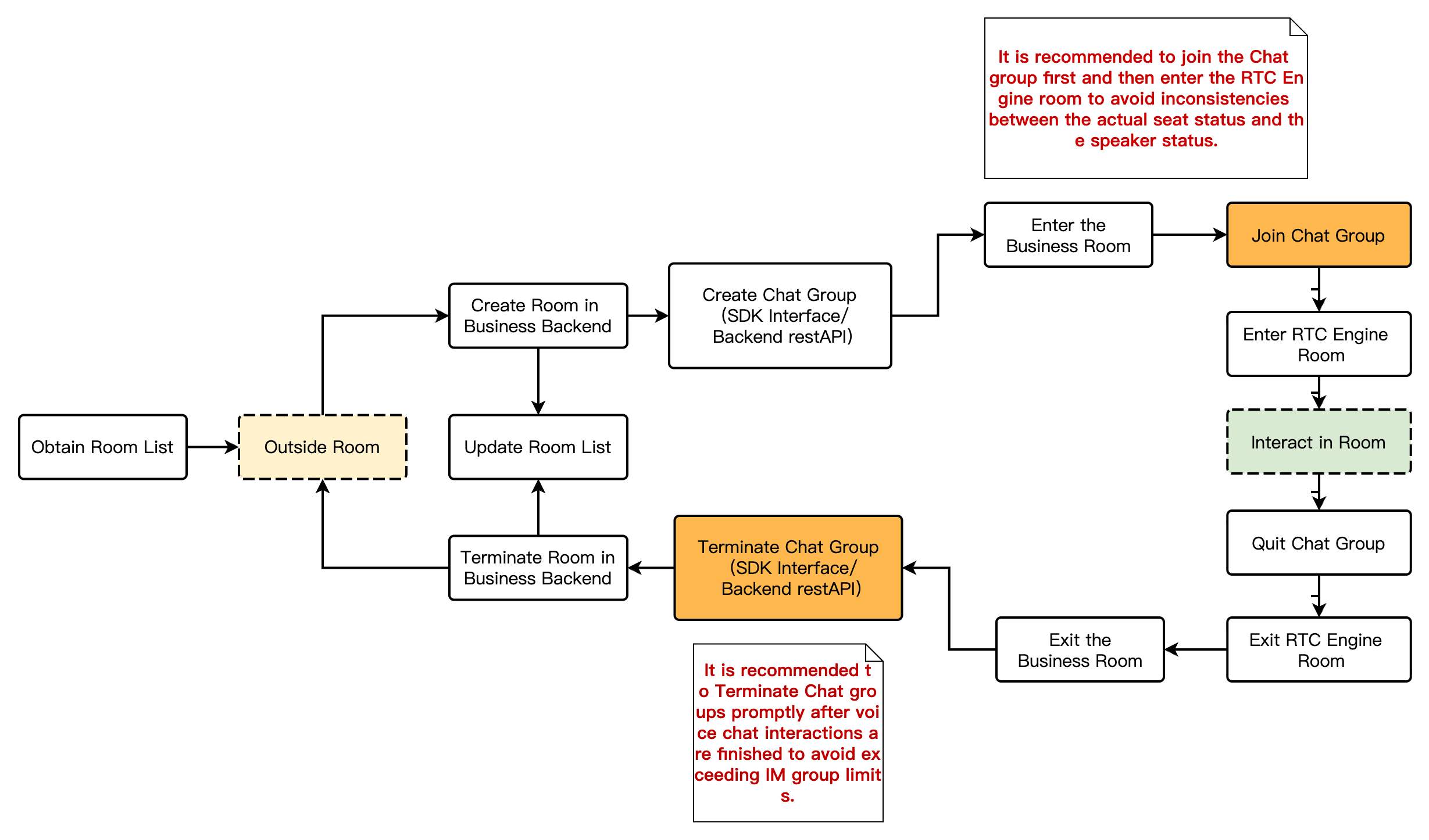 Chat Group Management: Mainly used for room member list, signaling receiving and transmission, and message interaction, such as approving/rejecting requests for becoming a speaker, inviting a listener to speak/removing a speaker, muting/unmuting seats, and blocking/unblocking a seat. It also distinguishes by group dimension, with features including creating a group, joining a group, exiting a group, and terminating a group.
