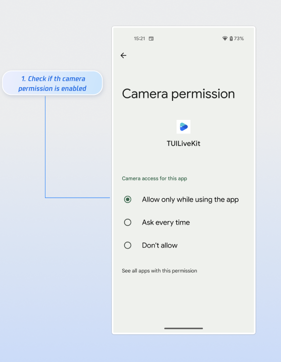 Please go to App Info > Permissions > Camera and check if the camera permission is enabled. Refer to the image below: