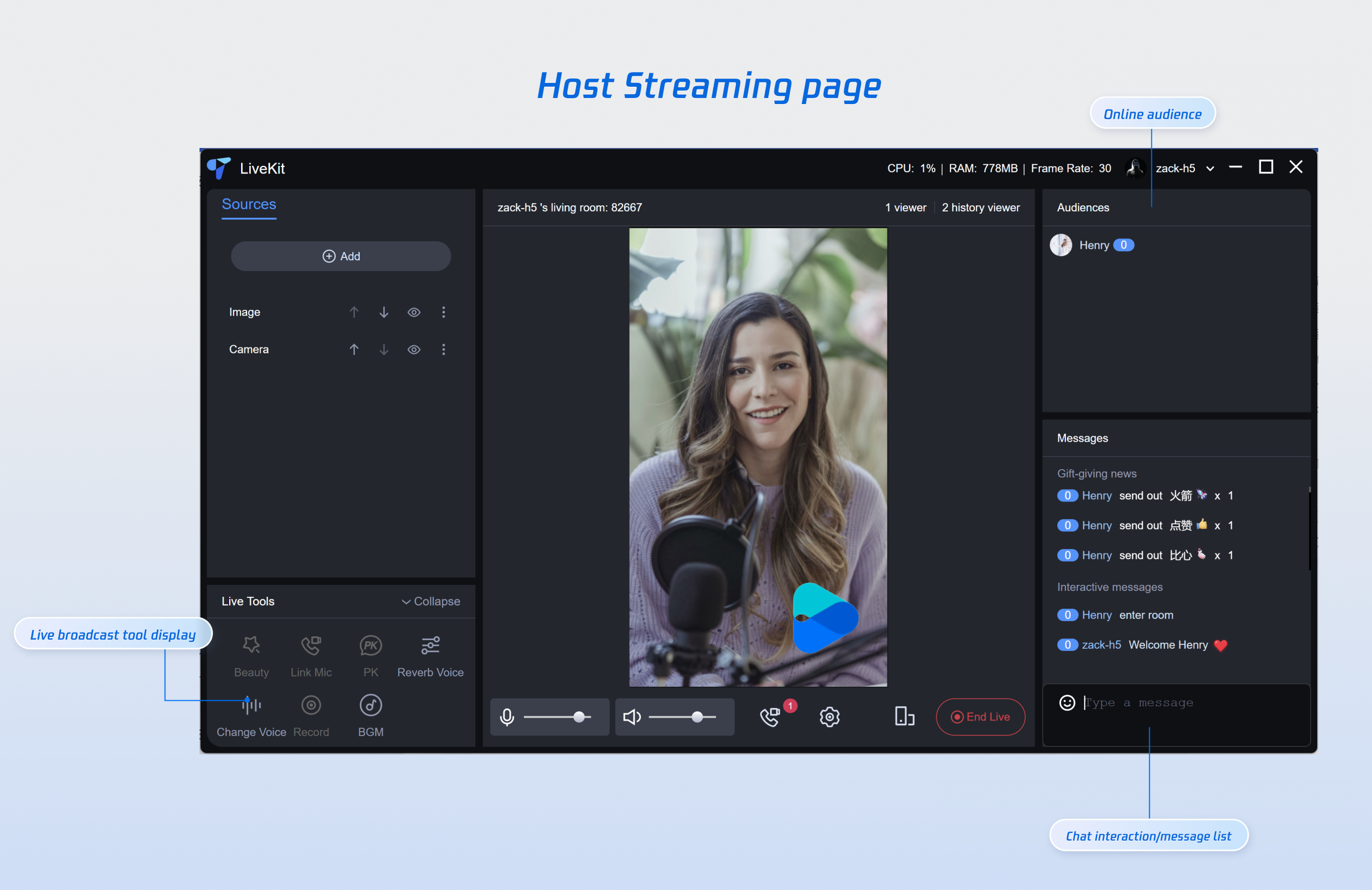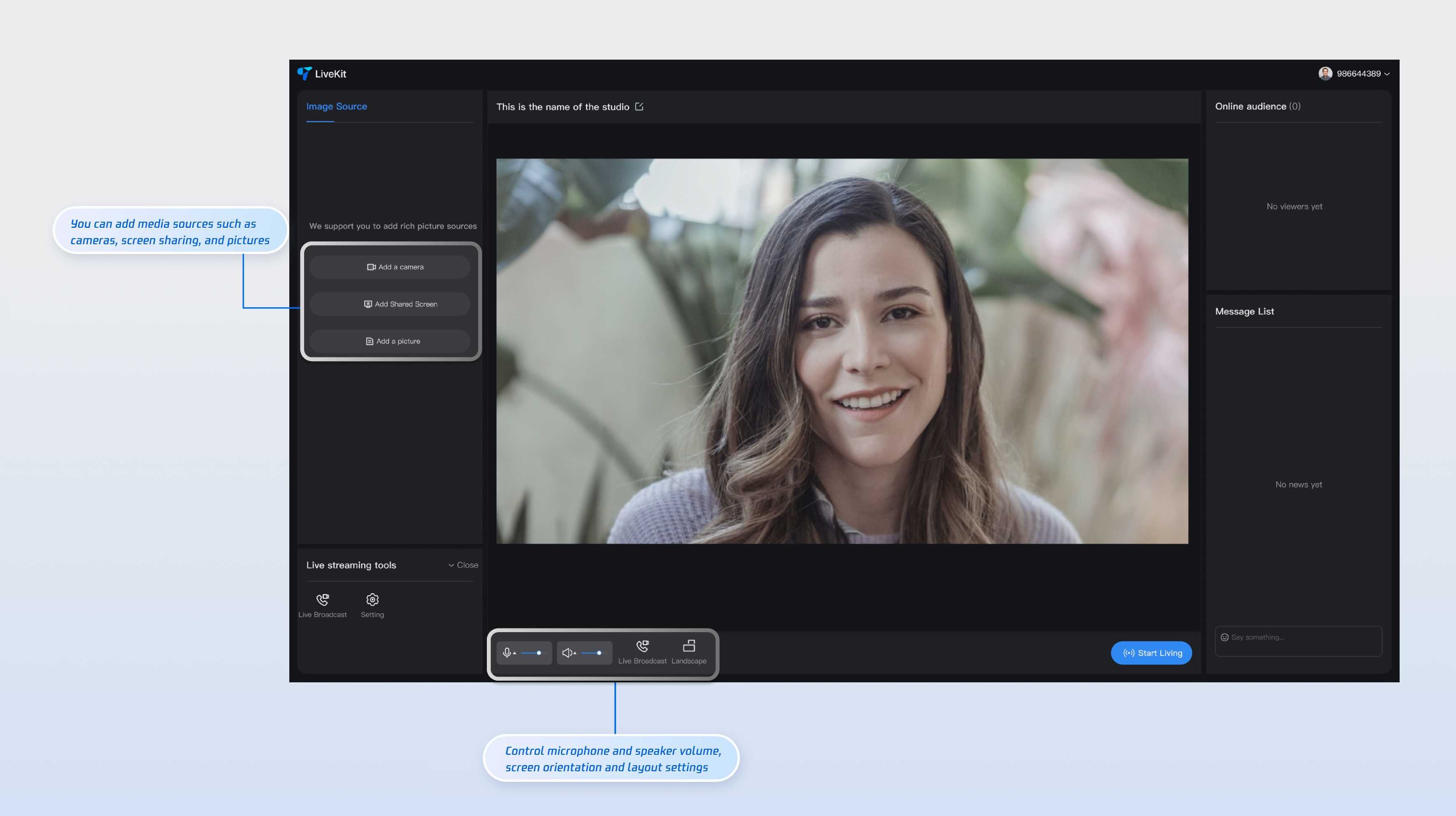 If you need to stream as a live streamer, you'll need to switch from the demo to the live streaming page. Simply change the URL in the navigation bar to http://localhost:5173/#/live-pusher to access the live streaming page. The live streaming page supports both landscape and portrait streaming. Additionally, you can add media sources to the page in the Add Sources area on the left. You can also click the Connect Viewer button below to accept or reject a viewer's request to connect.