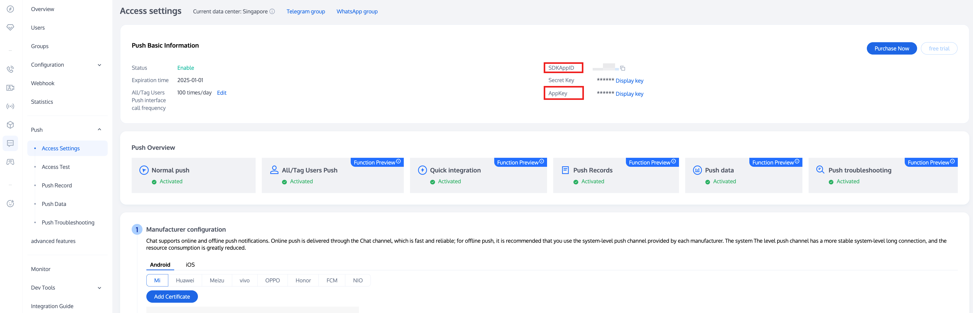Register push service. Just transmit both sdkAppId and appKey to complete push service registration.