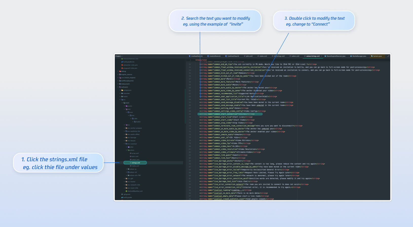 TUILiveKit uses standard Android XML resource files to manage the text displayed in the UI. You can directly modify the strings that need adjustment via the XML file: