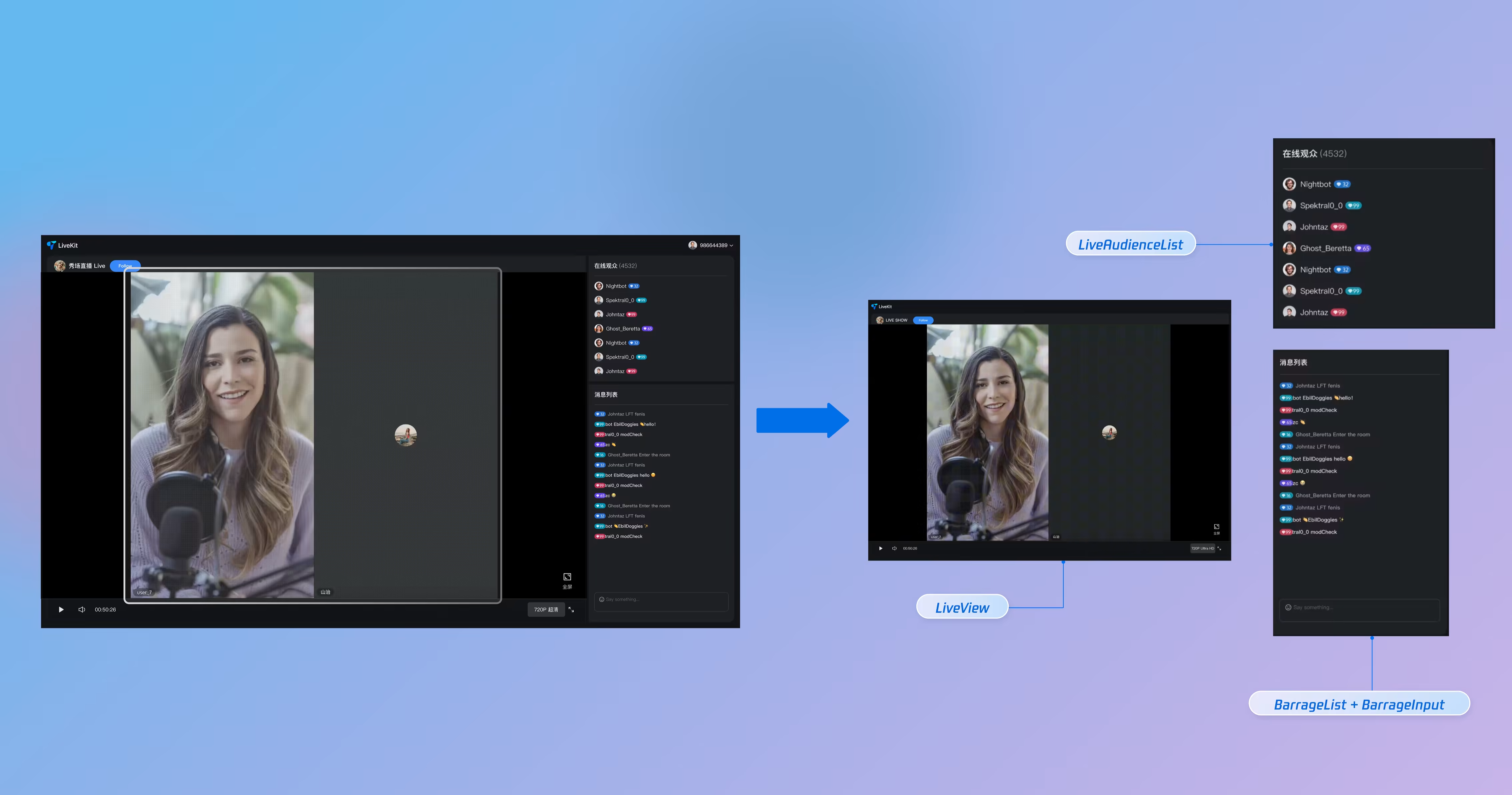 Full lifecycle management of live rooms: create, enter, leave, destroy room, query room list, modify live info (name, announcement, etc.), listen for live status (such as being removed, ended).