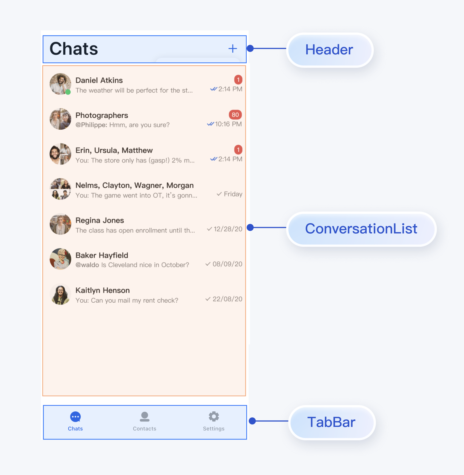 ConversationsPage, ChatPage, and ContactsPage expose several user click events. You can customize these events to implement navigation between pages: