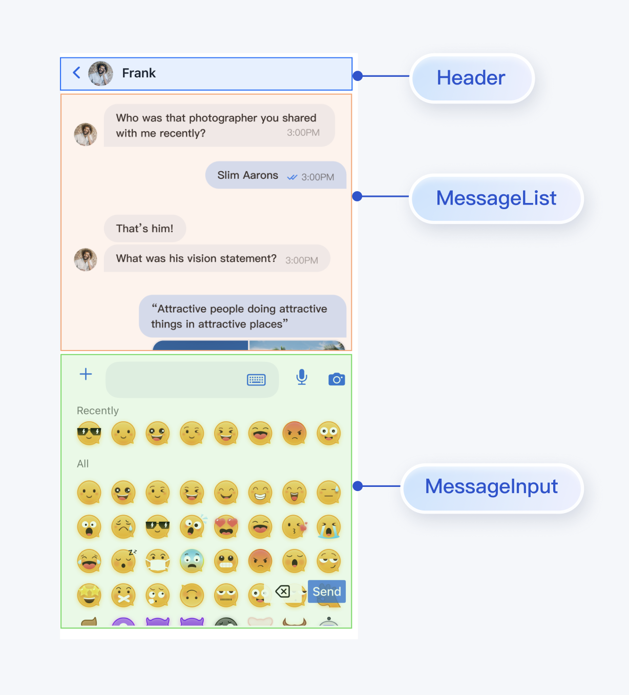 You can integrate MessageList and MessageInput directly into an existing app page or create a new chat page. Example UI effect: