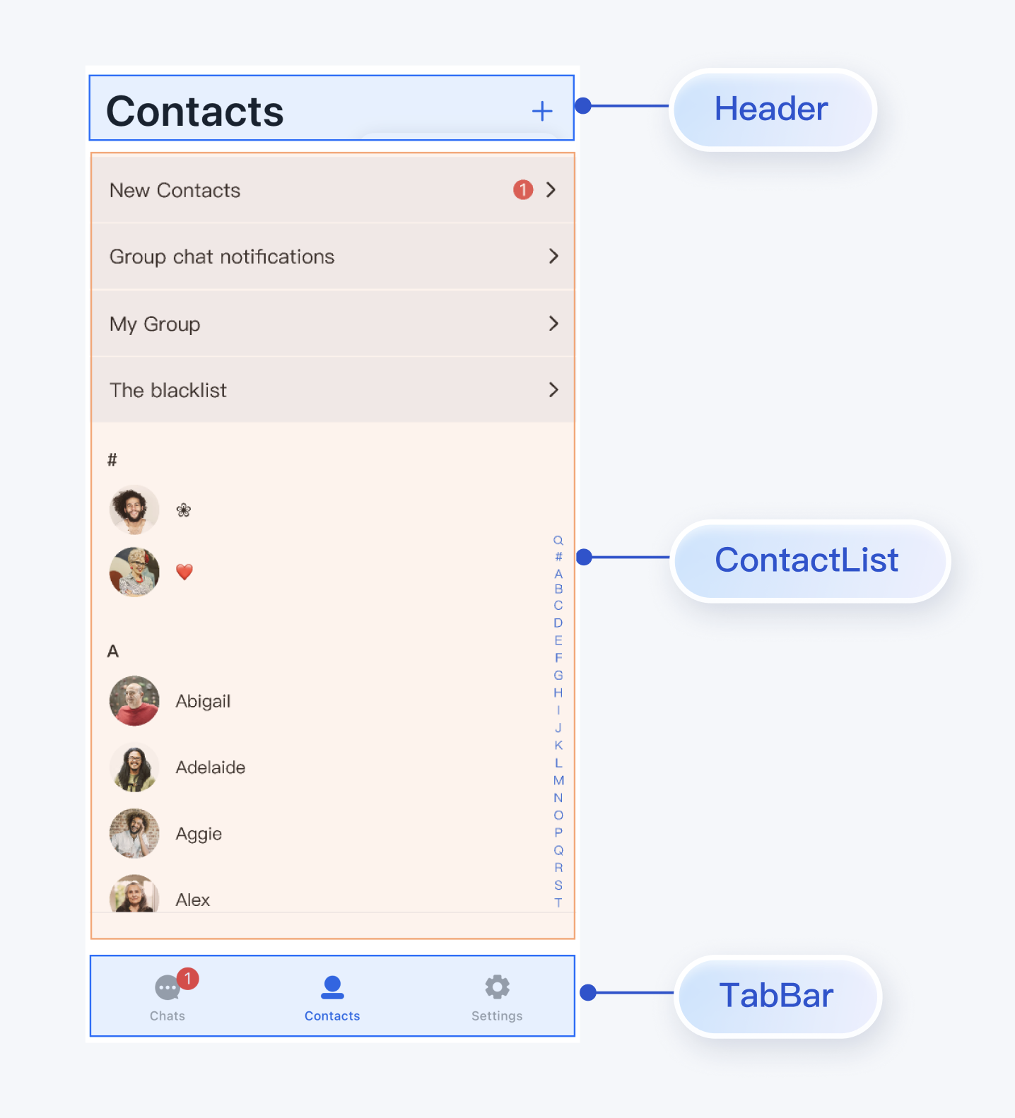 You can integrate ContactList directly into your existing app or create a new contact list page. Example UI effect: