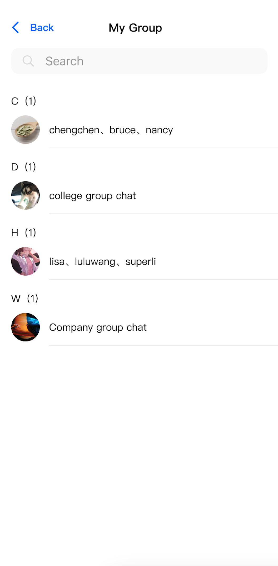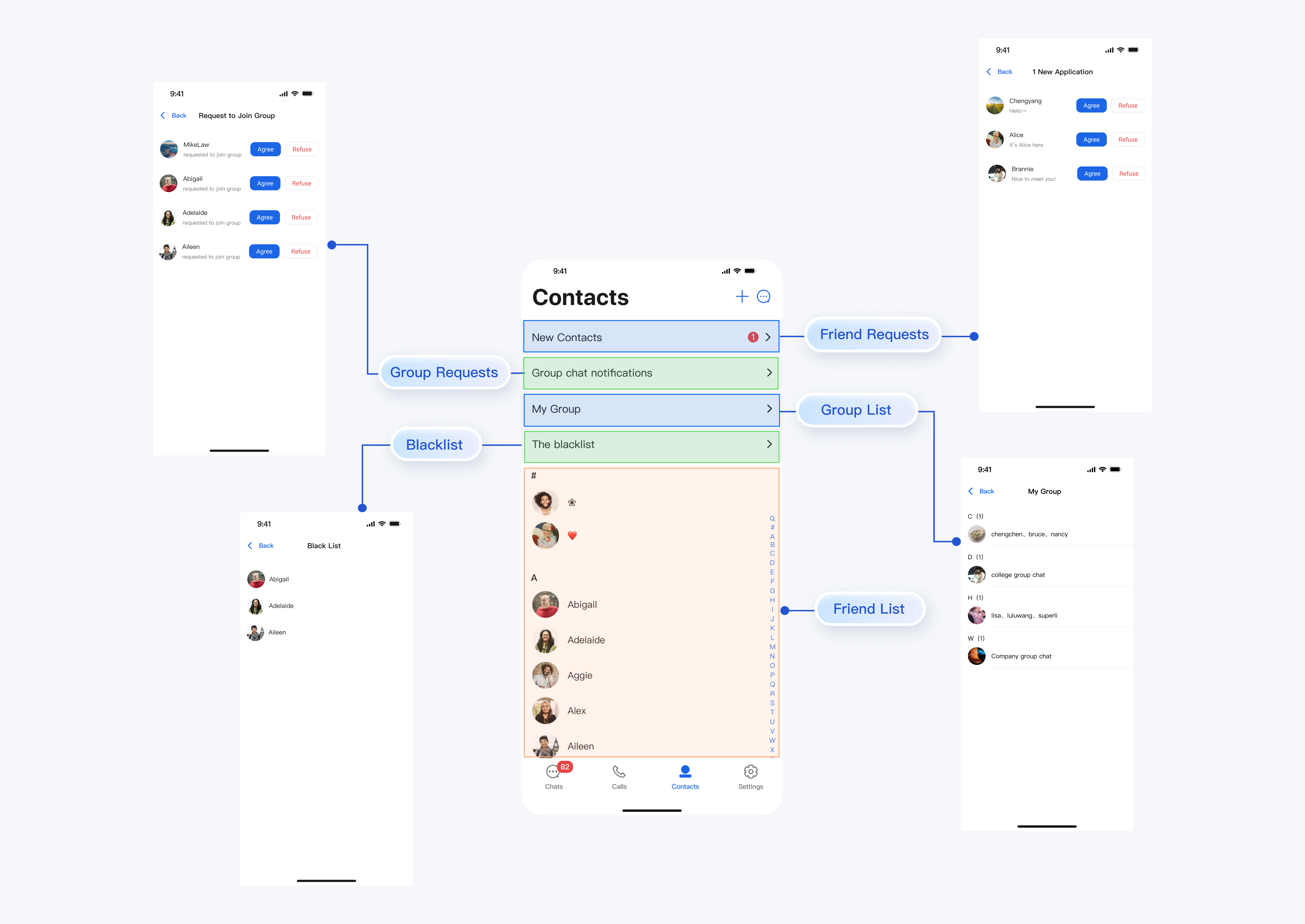 The top section of ContactList provides entry points for subviews such as friend requests, group chat requests, group chat list, and blacklist. The bottom section displays the contact list, as shown below: