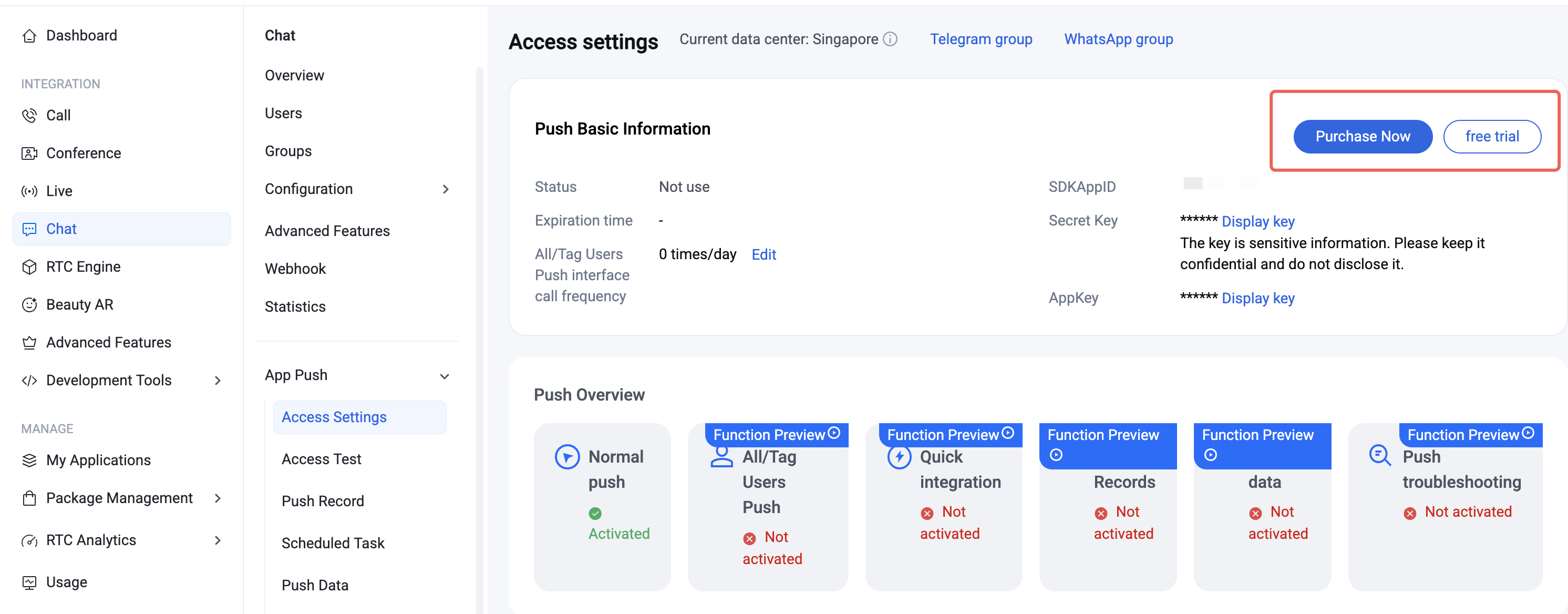Navigate to Chat Console > App Push > Integration Settings, then click Purchase Now or Free Trial (each app can try the free trial once, valid for 7 days).
