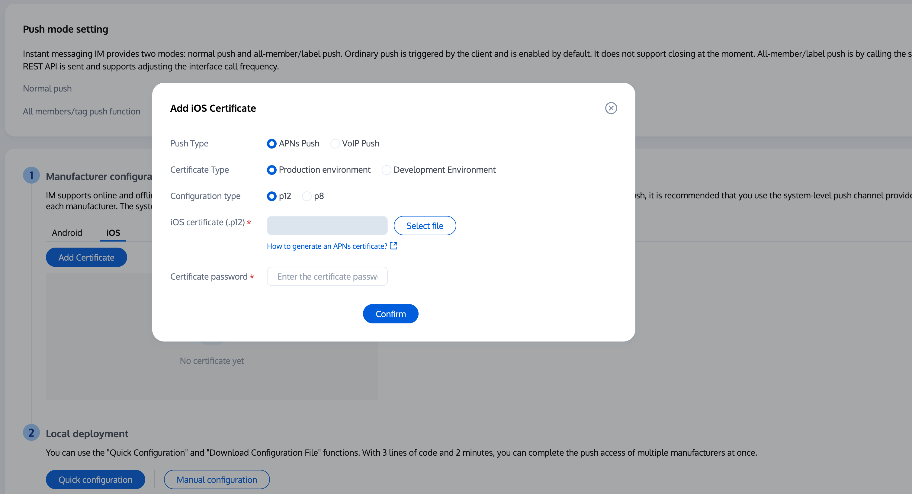 3. In Access Settings, switch to iOS, click Add Certificate, select certificate type, upload the iOS certificate (.p12), set the certificate password, and click Confirm.